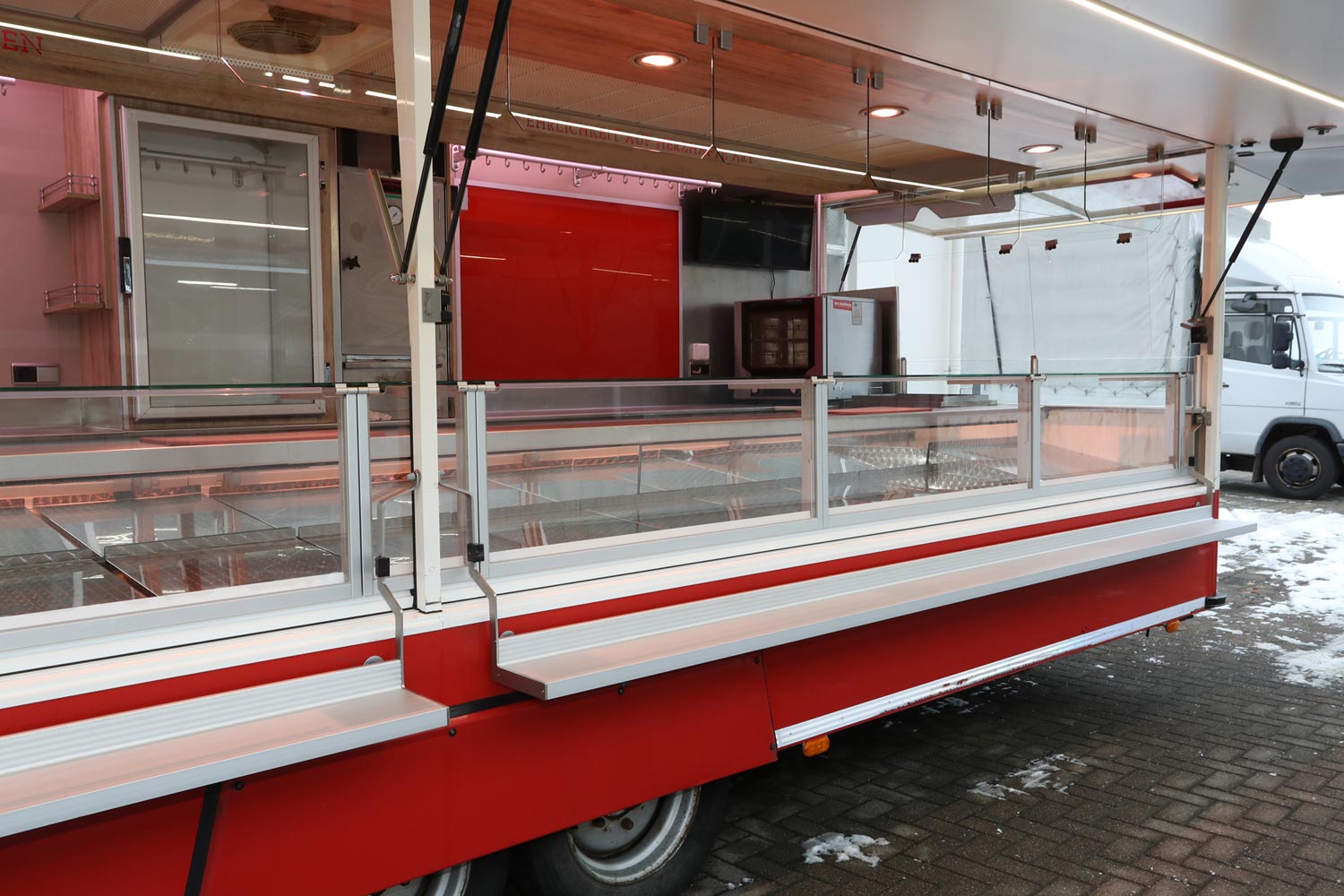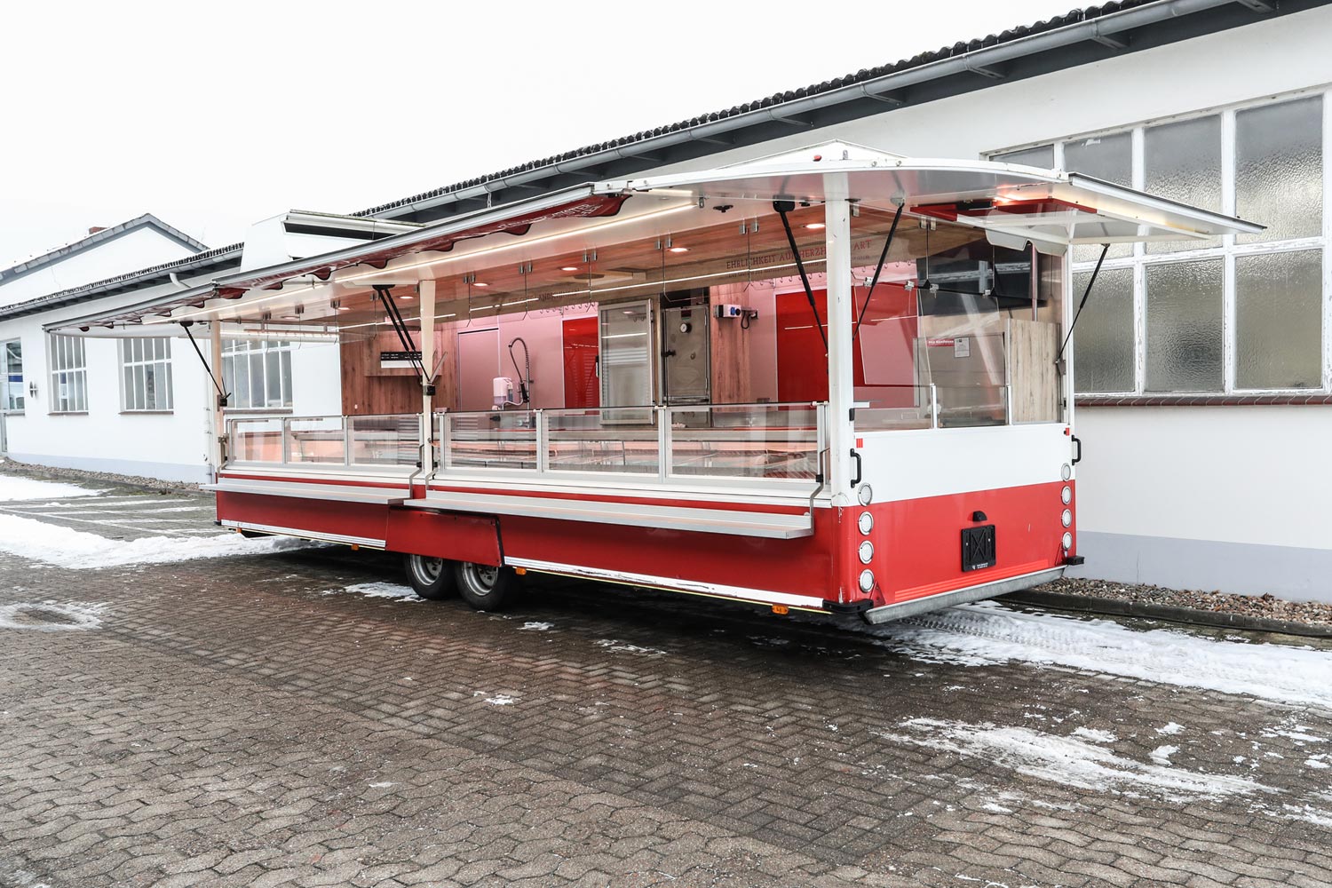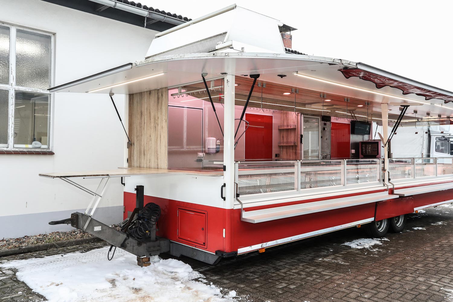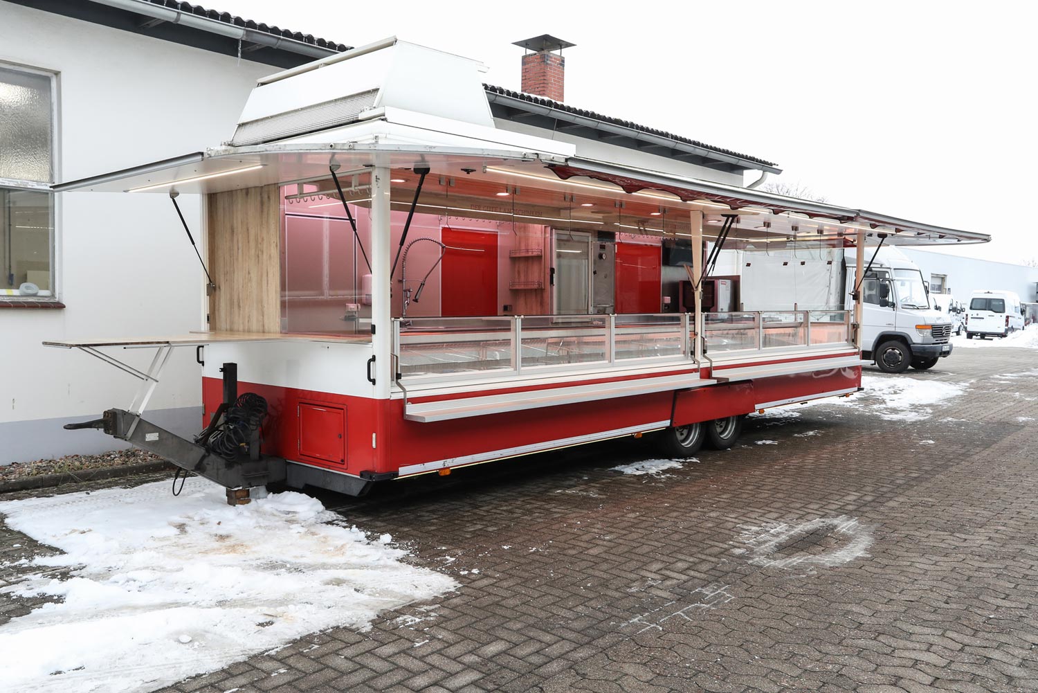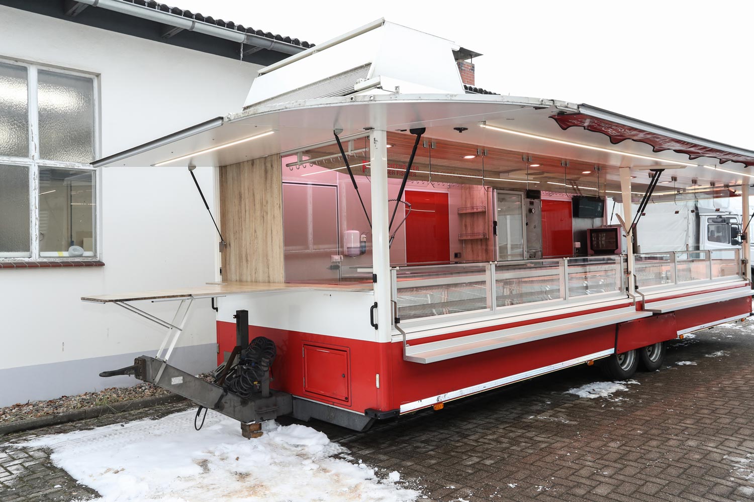 Verkaufsanhänger mit Druckluftbremse mit ABS, hydraulischer Absenkung, Verkaufsklappen an Stirn und Heckseite, Schaufenster und Esstisch an Stirnseite, Imbissgeräte, verstärkte Kühlleistung, BÄRO LED-Strahler, Radio, Gasanlage, Werbetafeln uvm.