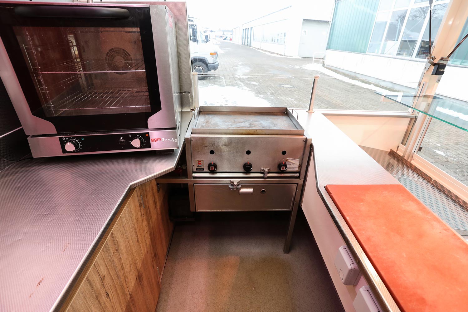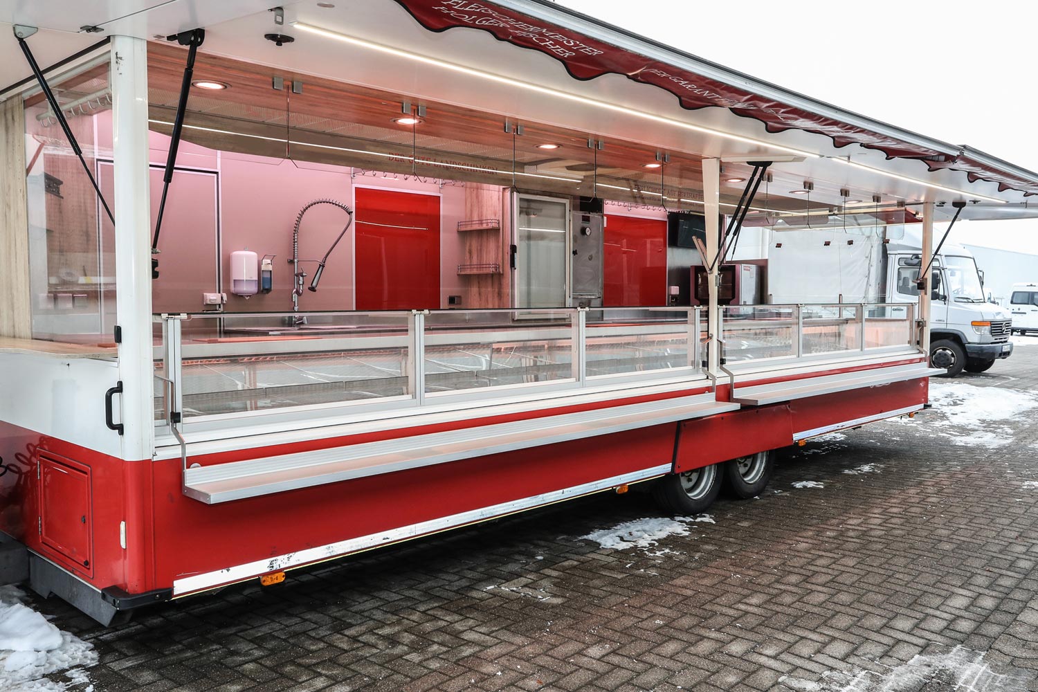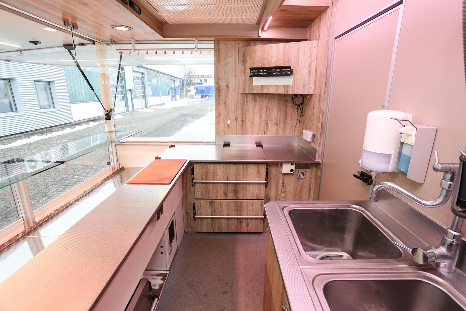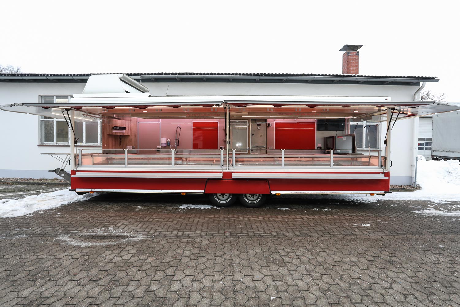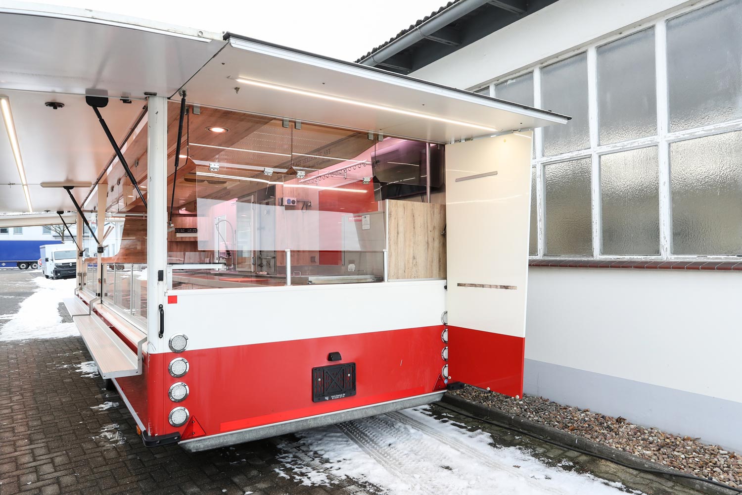 Verkaufsanhänger mit Druckluftbremse mit ABS, hydraulischer Absenkung, Verkaufsklappen an Stirn und Heckseite, Schaufenster und Esstisch an Stirnseite, Imbissgeräte, verstärkte Kühlleistung, BÄRO LED-Strahler, Radio, Gasanlage, Werbetafeln uvm.