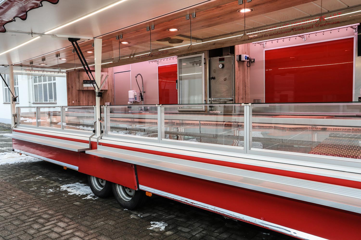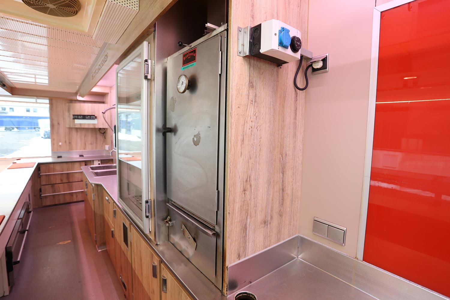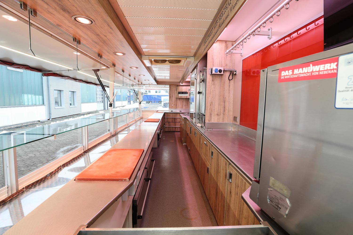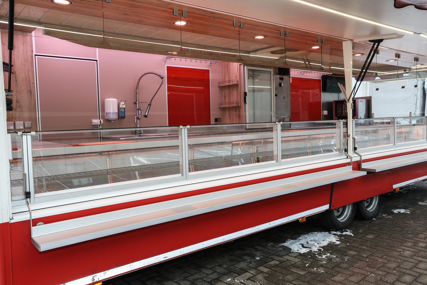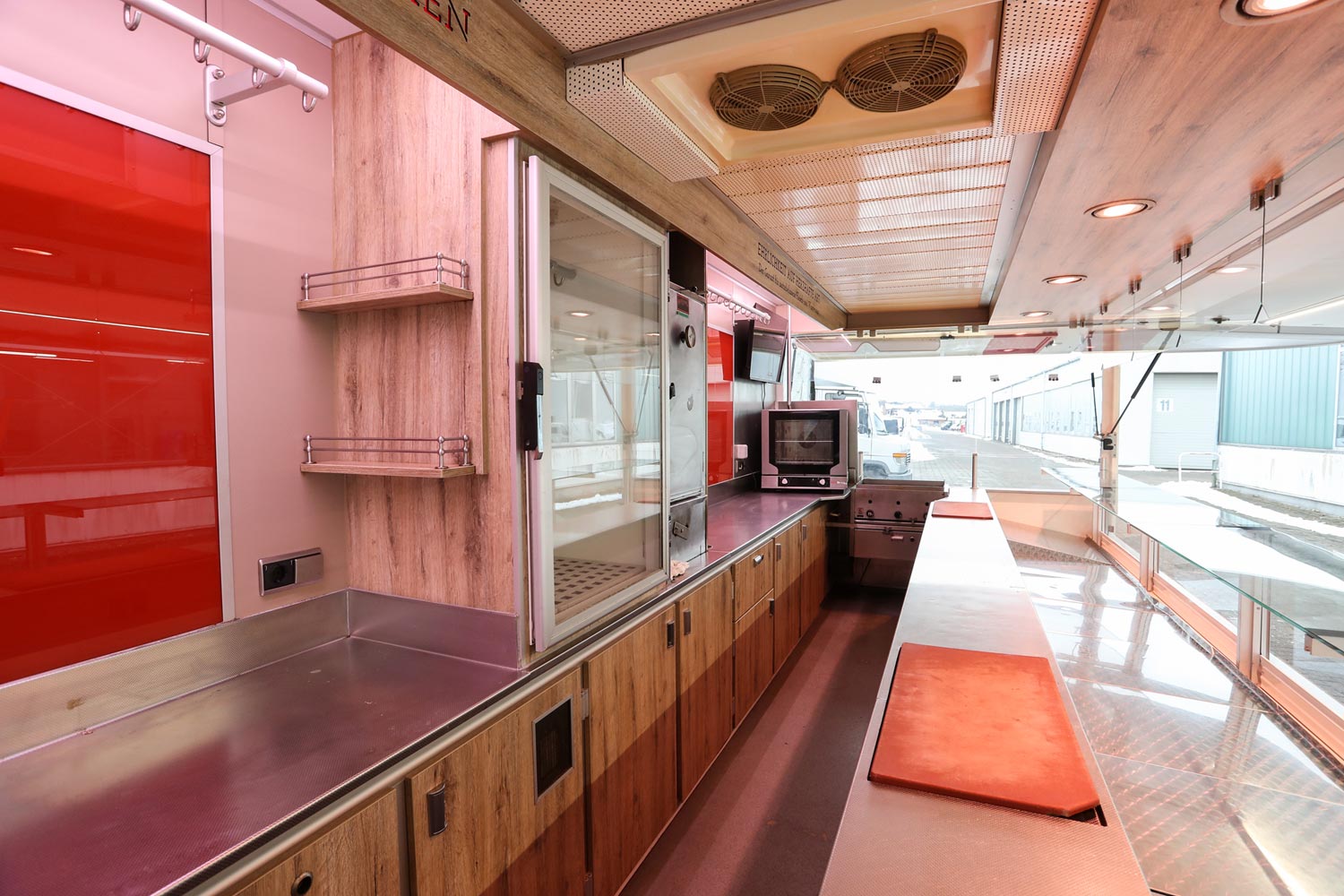 Verkaufsanhänger mit Druckluftbremse mit ABS, hydraulischer Absenkung, Verkaufsklappen an Stirn und Heckseite, Schaufenster und Esstisch an Stirnseite, Imbissgeräte, verstärkte Kühlleistung, BÄRO LED-Strahler, Radio, Gasanlage, Werbetafeln uvm.