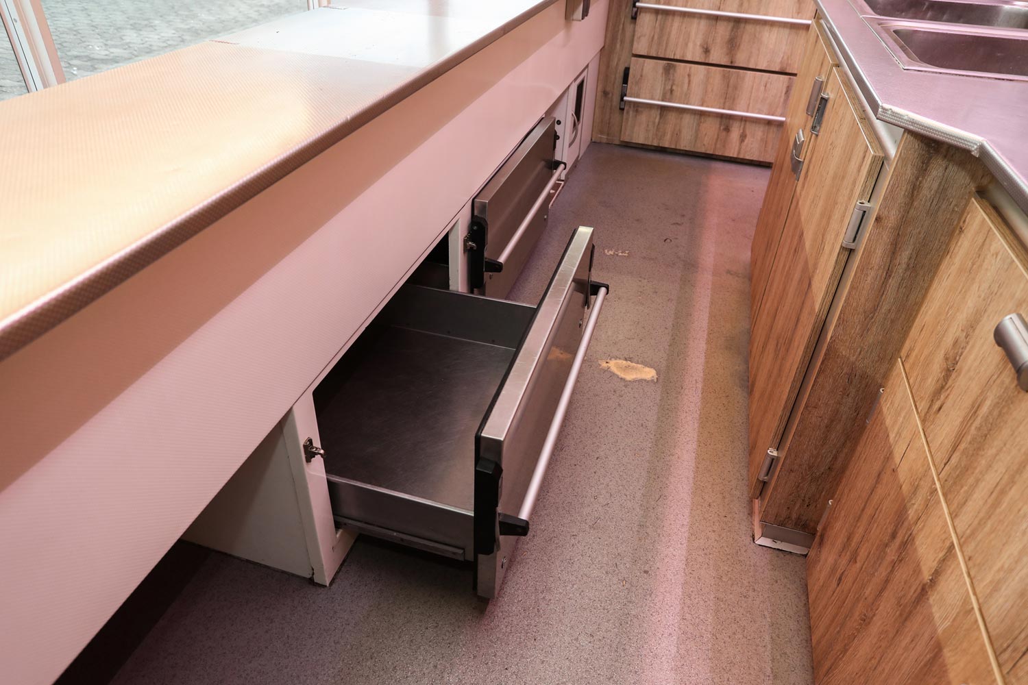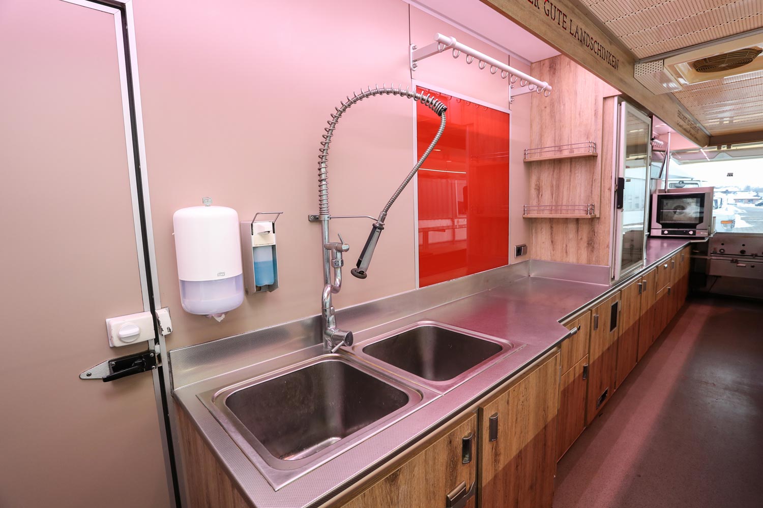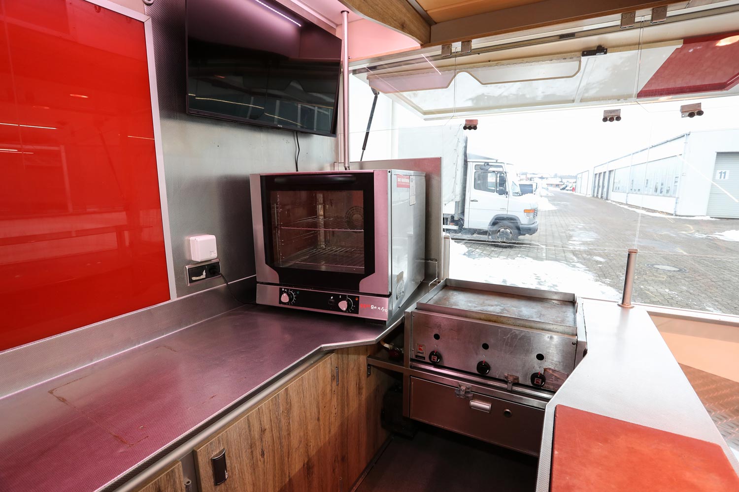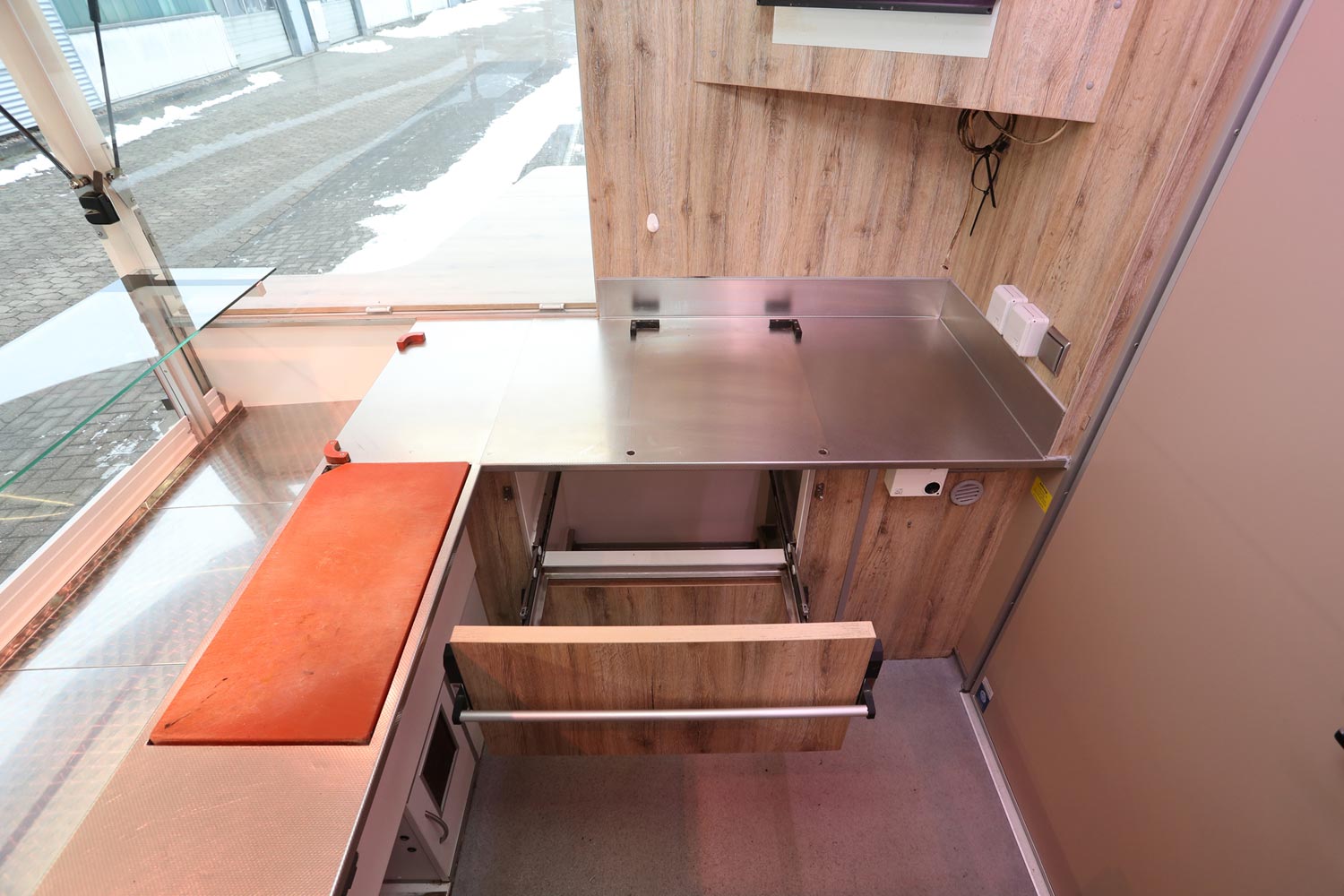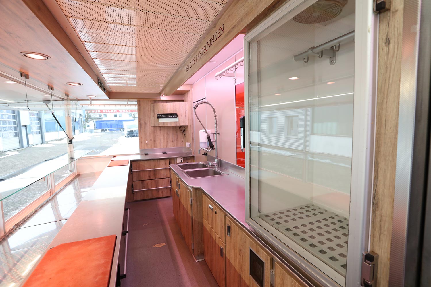 Verkaufsanhänger mit Druckluftbremse mit ABS, hydraulischer Absenkung, Verkaufsklappen an Stirn und Heckseite, Schaufenster und Esstisch an Stirnseite, Imbissgeräte, verstärkte Kühlleistung, BÄRO LED-Strahler, Radio, Gasanlage, Werbetafeln uvm.