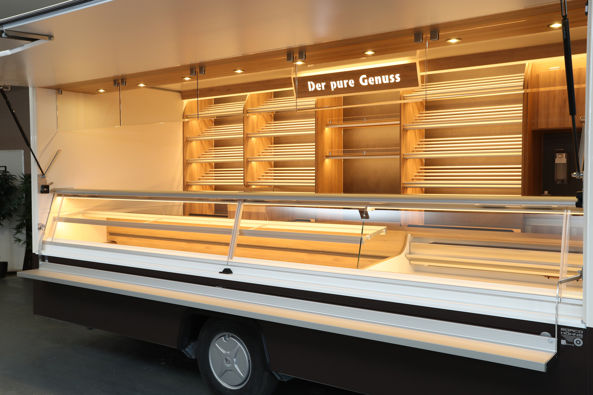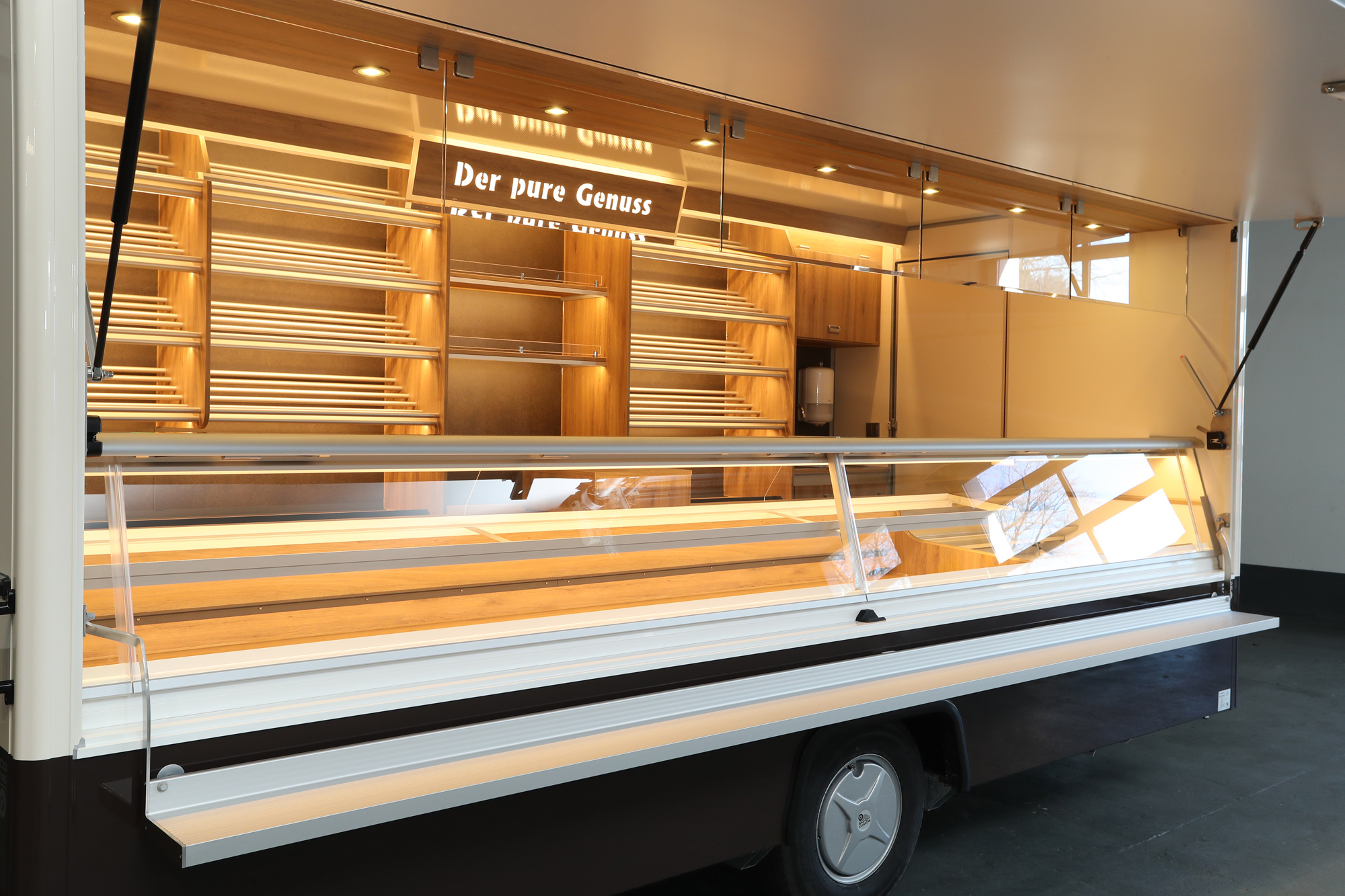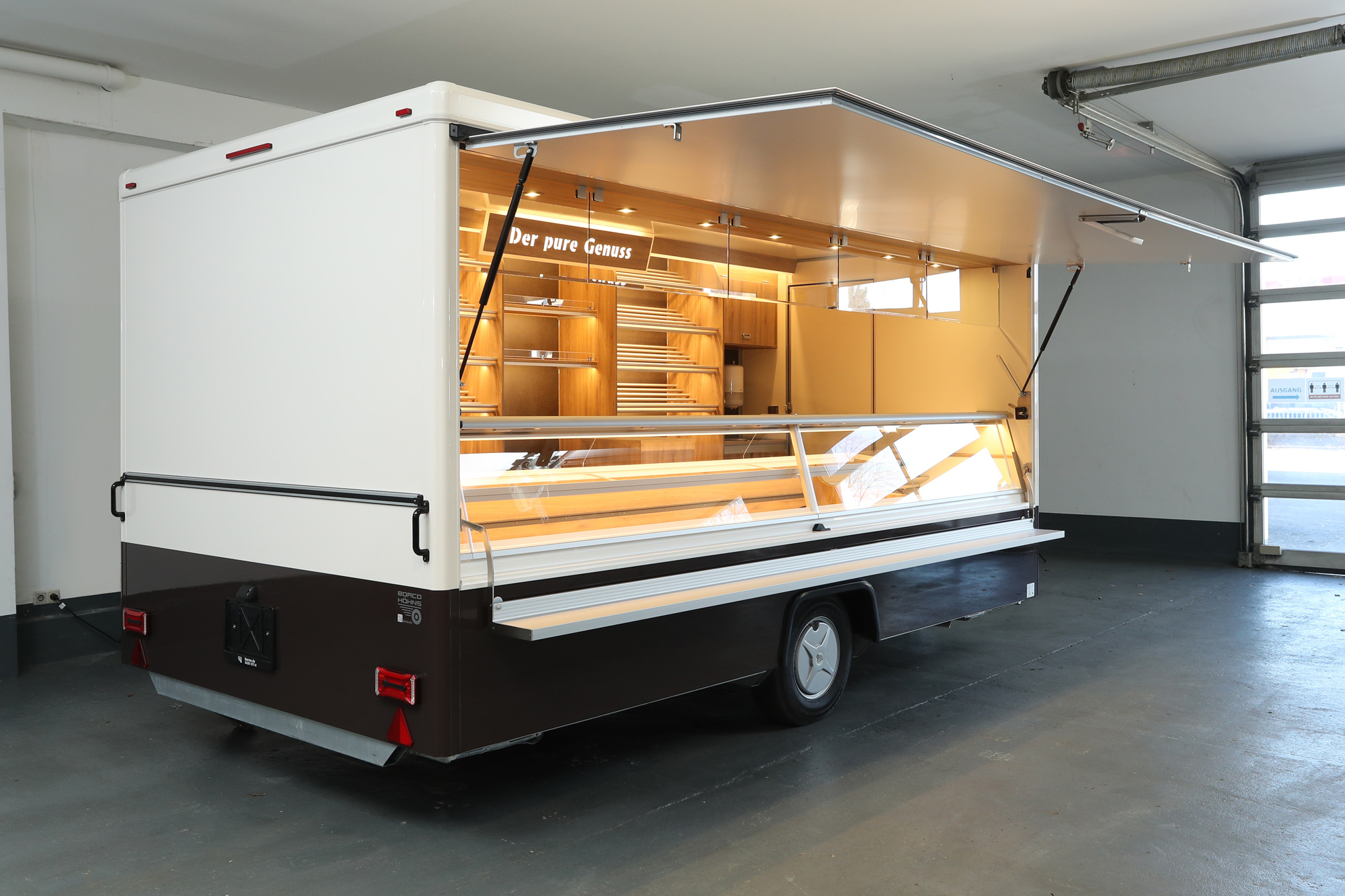 • Hochwertiger Verkaufsanhänger mit Aluminium Brotborden und LED-Beleuchtung