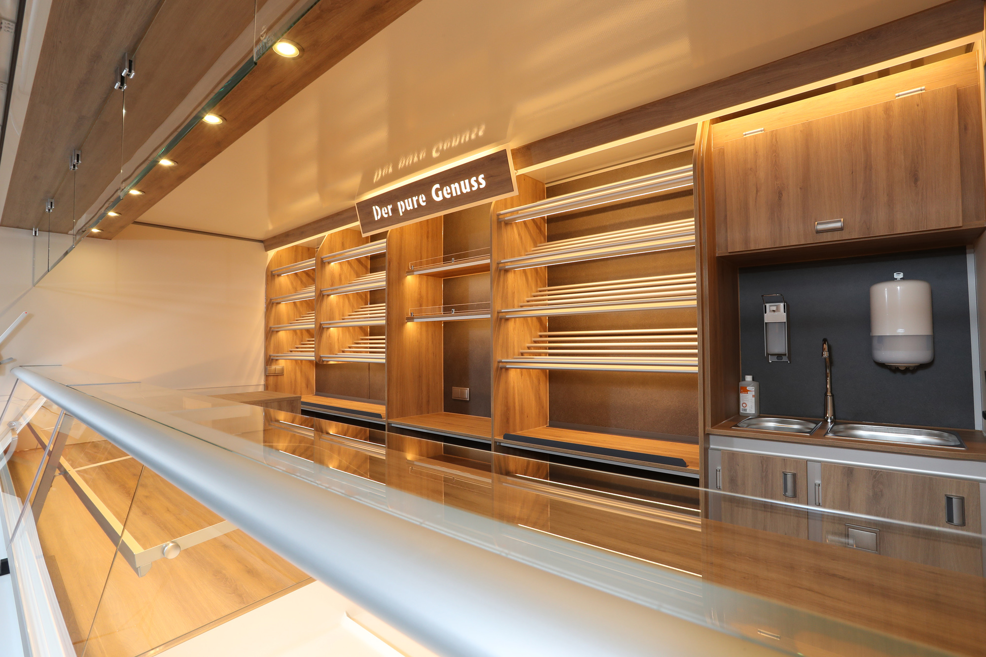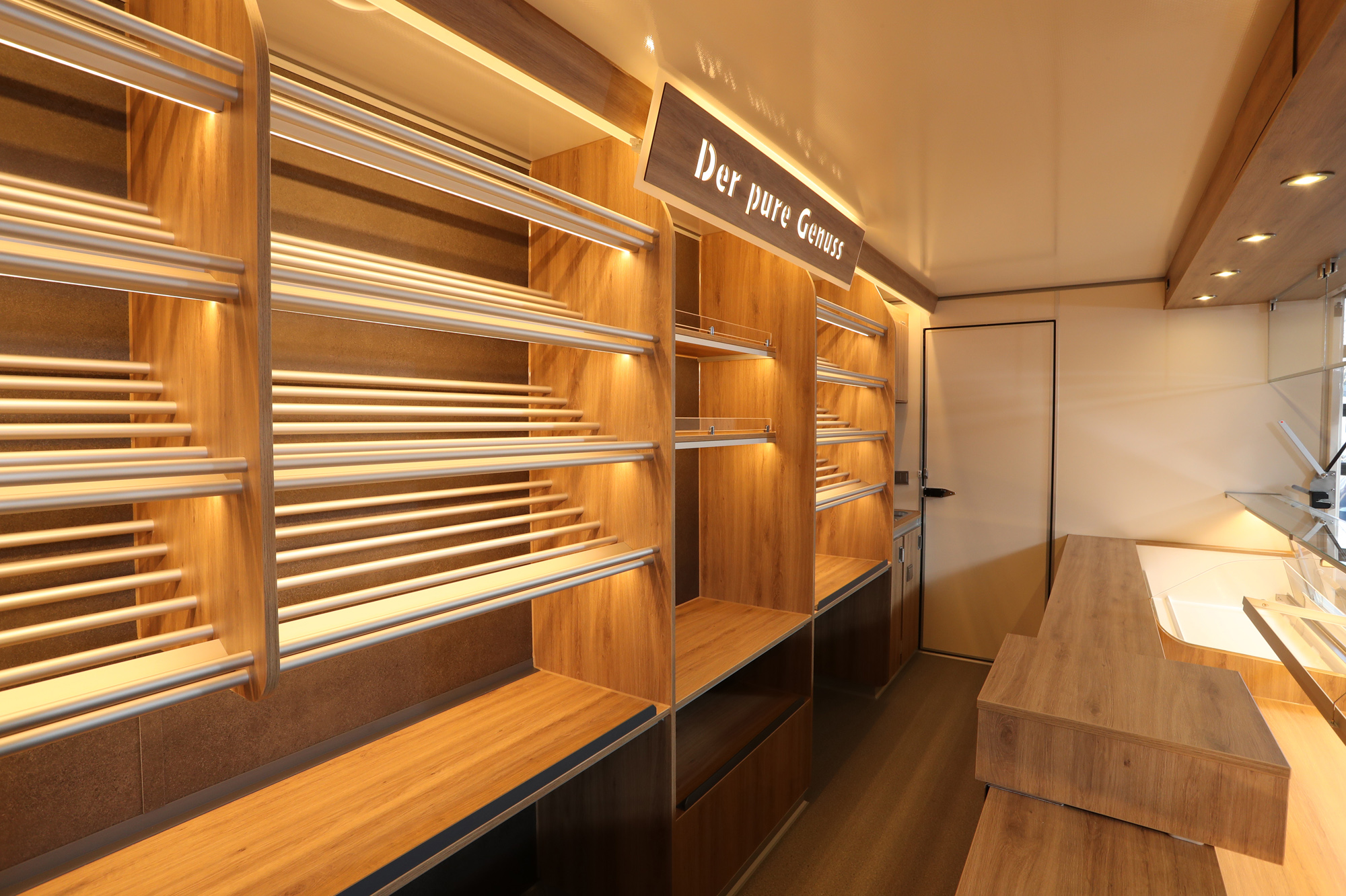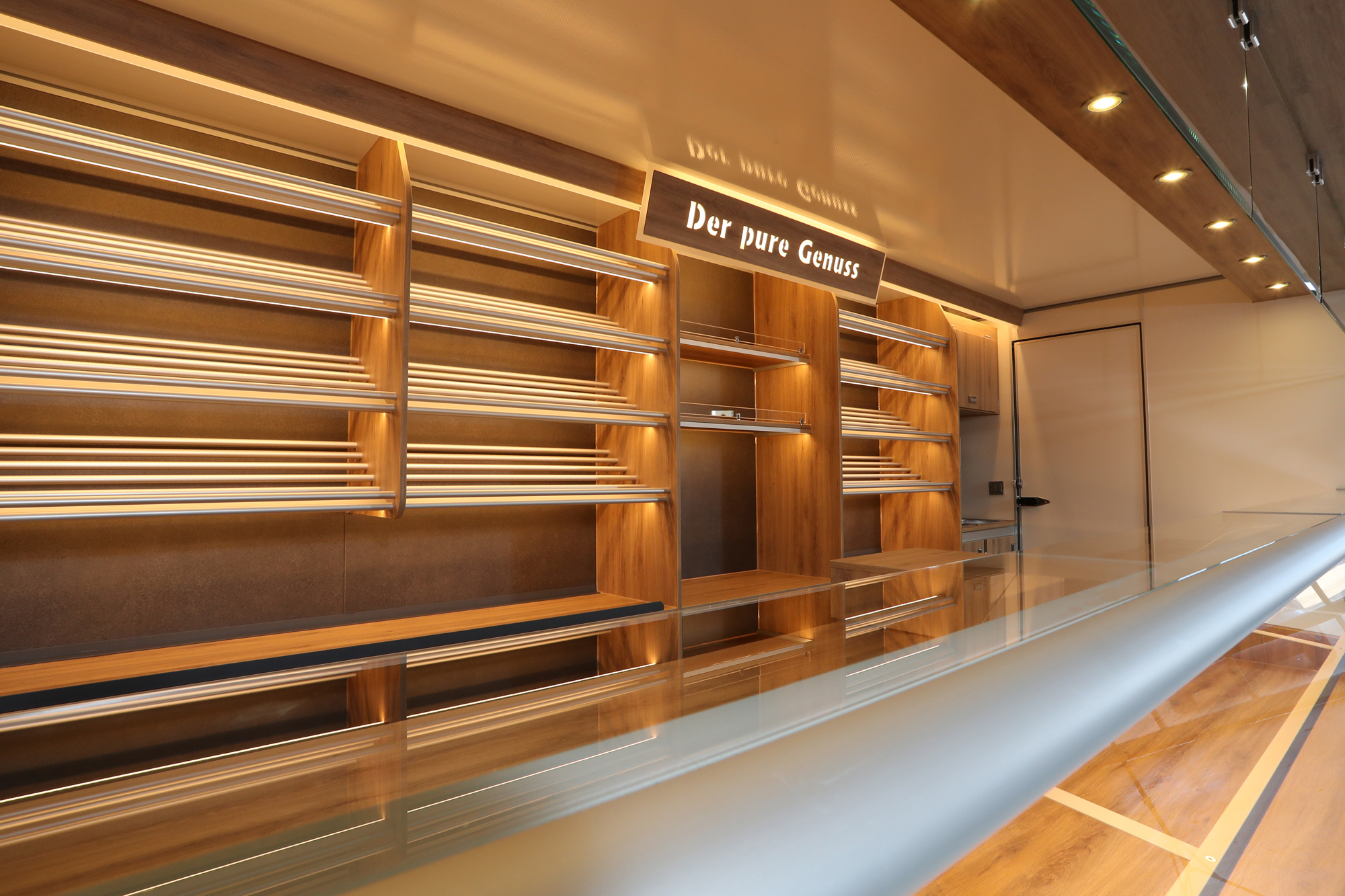 • Hochwertiger Verkaufsanhänger mit Aluminium Brotborden und LED-Beleuchtung