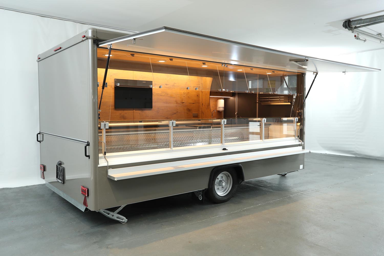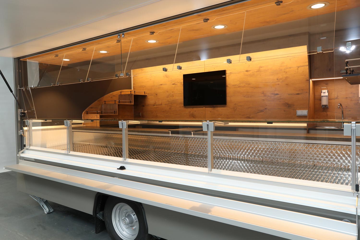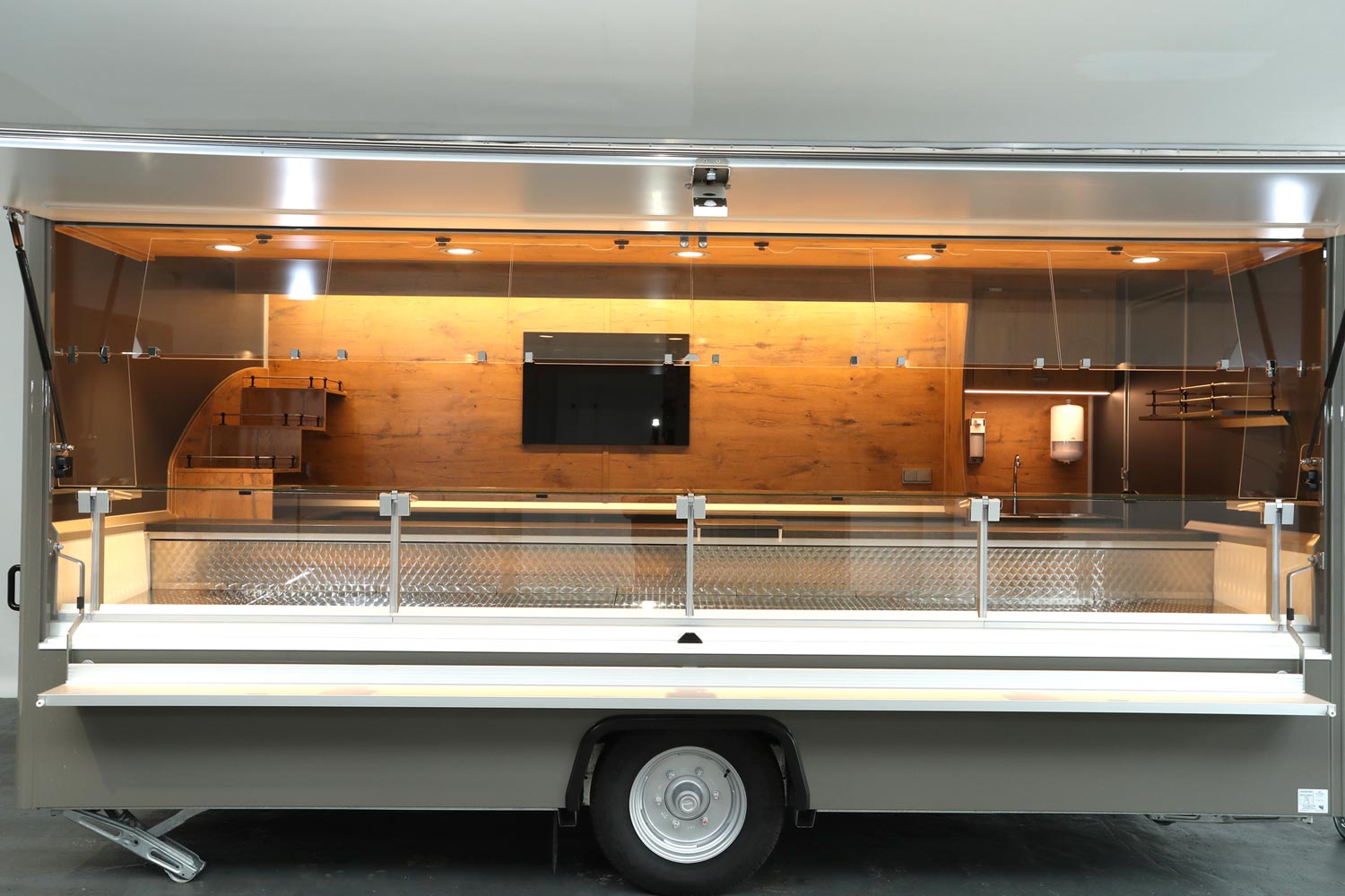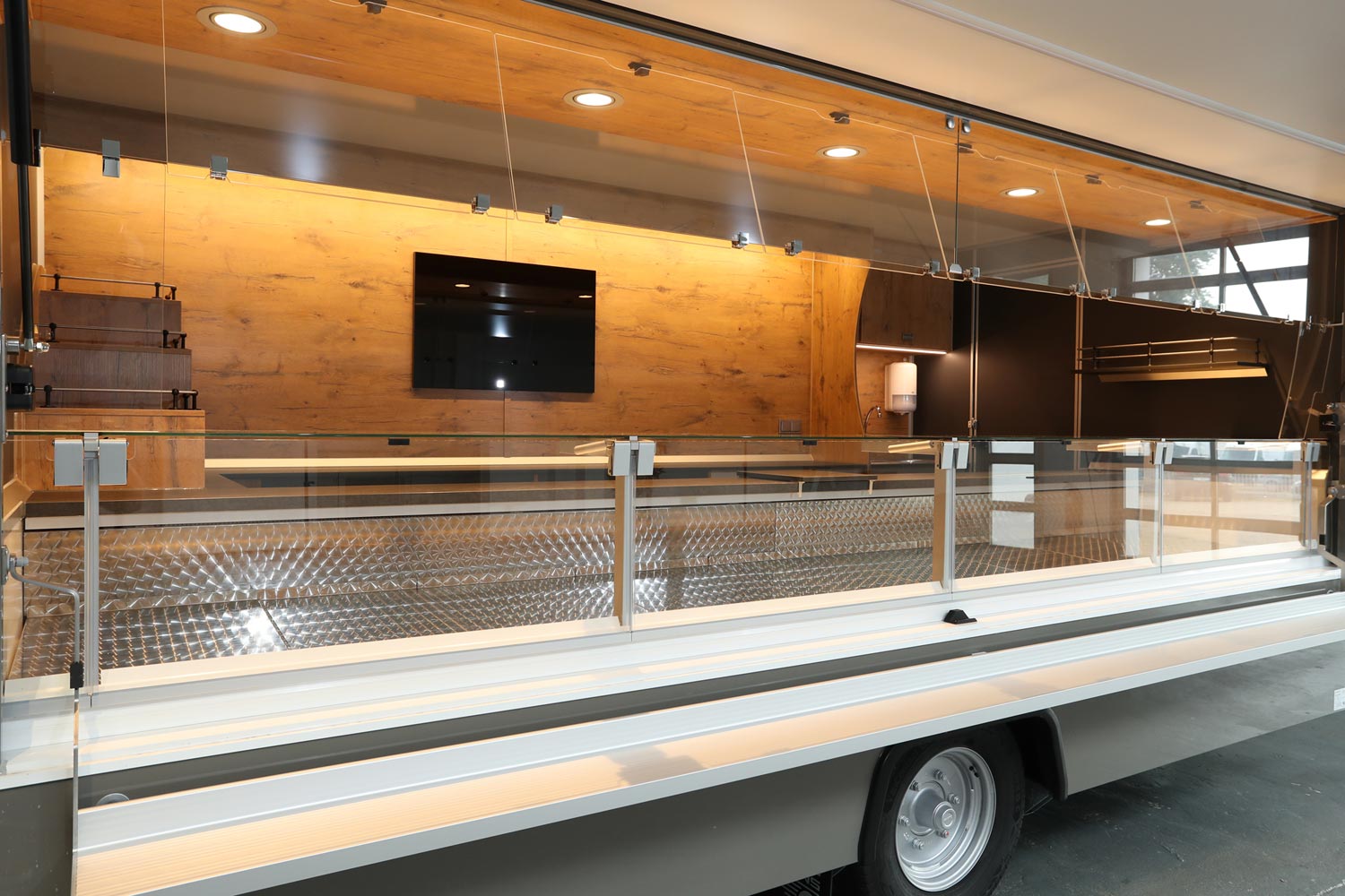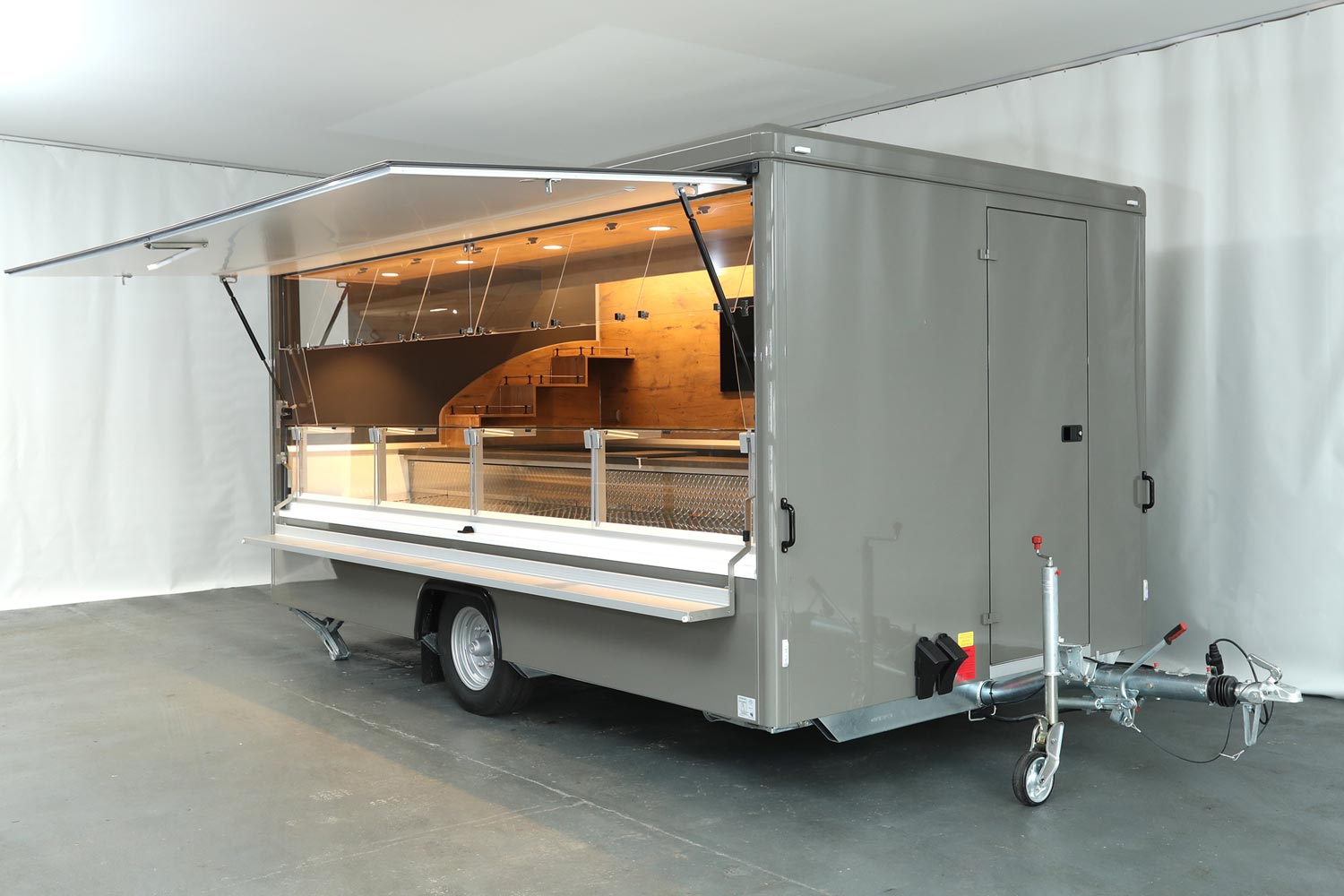 stille Kühlung, 2 Kühlauszüge für 4 E-Kisten, Warentreppe, Wandregal, Windschutz in der Verkaufsöffnung, LED Beleuchtung und Glasschriftfeld