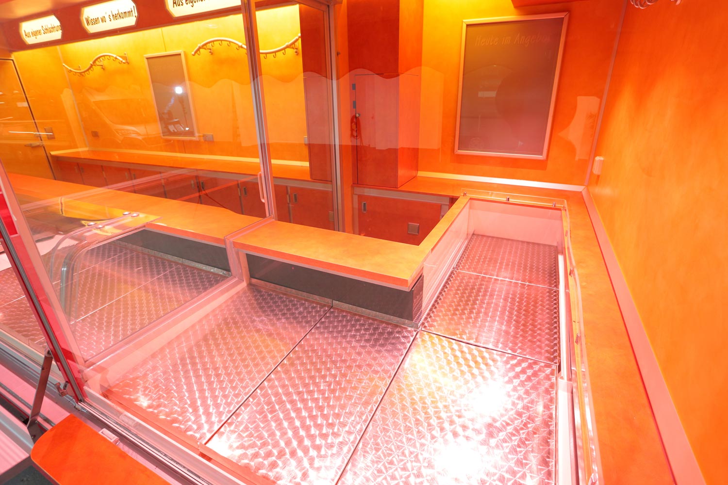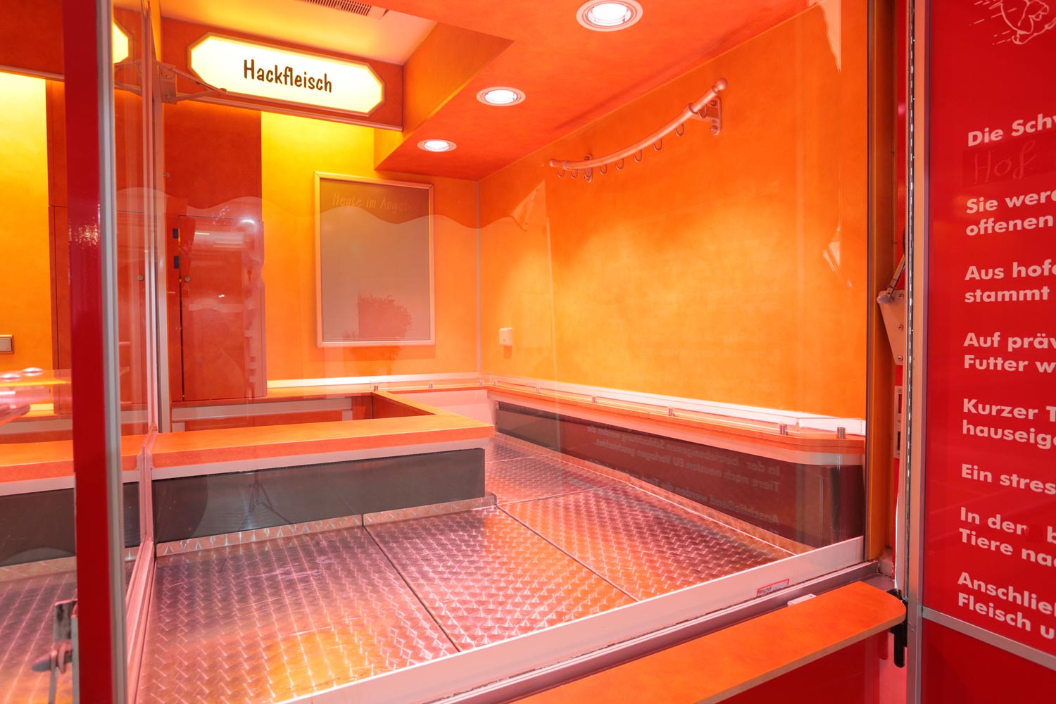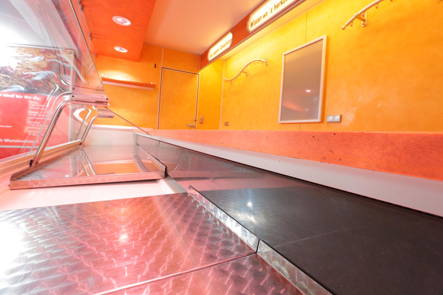 Gepflegtes Wochenmarkt Verkaufsmobil mit geringer Kilometerleistung. Panorama-Kühltheke mit verstärkter Kühlleistung 32°, 3 Kühlfächer und Bäro-Strahler über der Theke, separates Frischfleischabteil,  Anhängekupplung bis 2.000 kg, Gasheizung uvm.