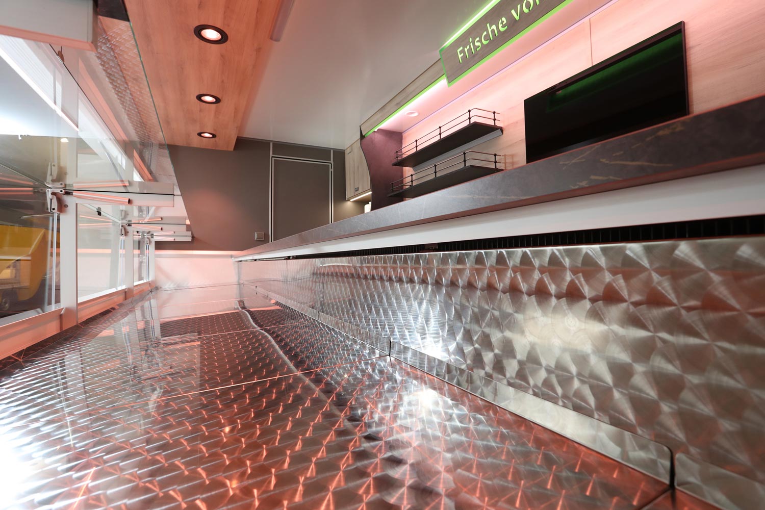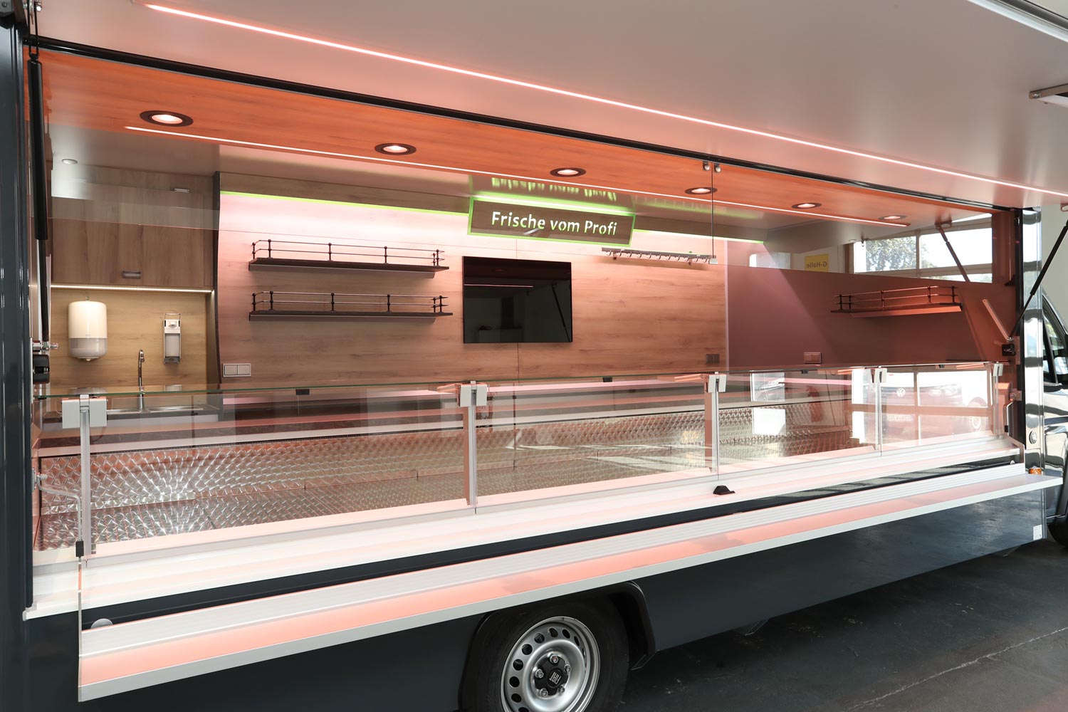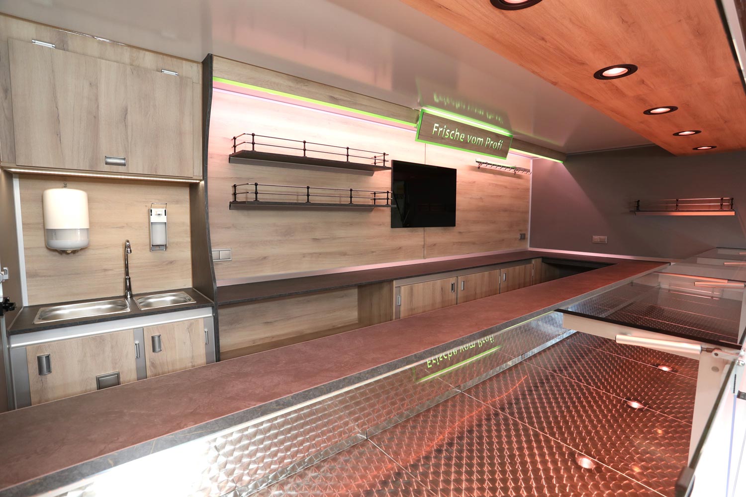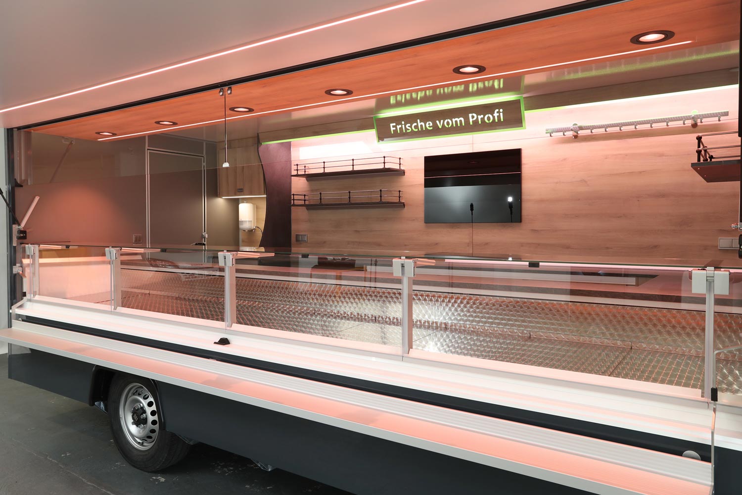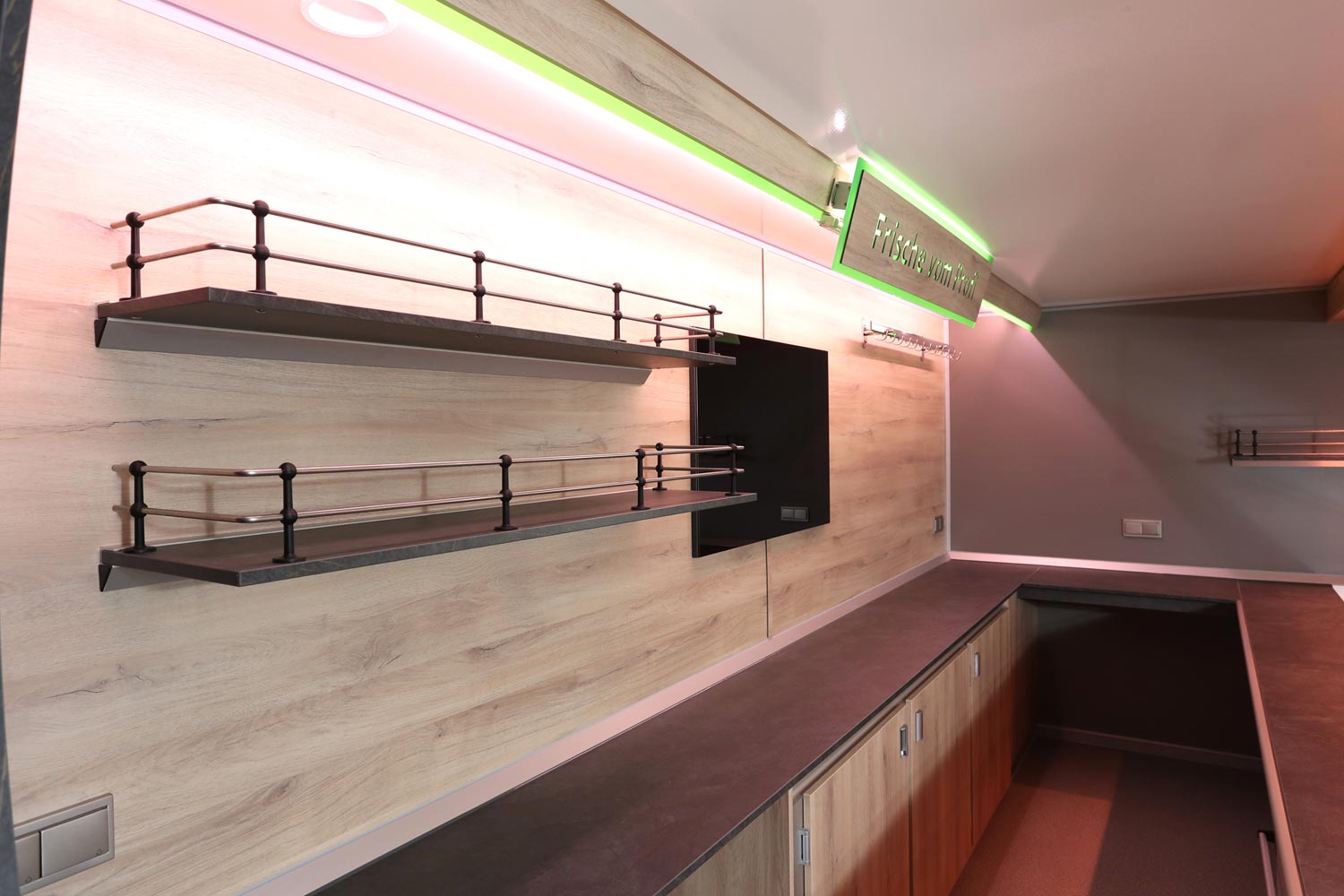 5.000mm Verkaufskühltheke, 3 Kühlauszüge für 6 E-Kisten, Hakenschienen, Wandregal, LED-Beleuchtung, 3 Schränke mit Drehtüren, Glaswerbetafel