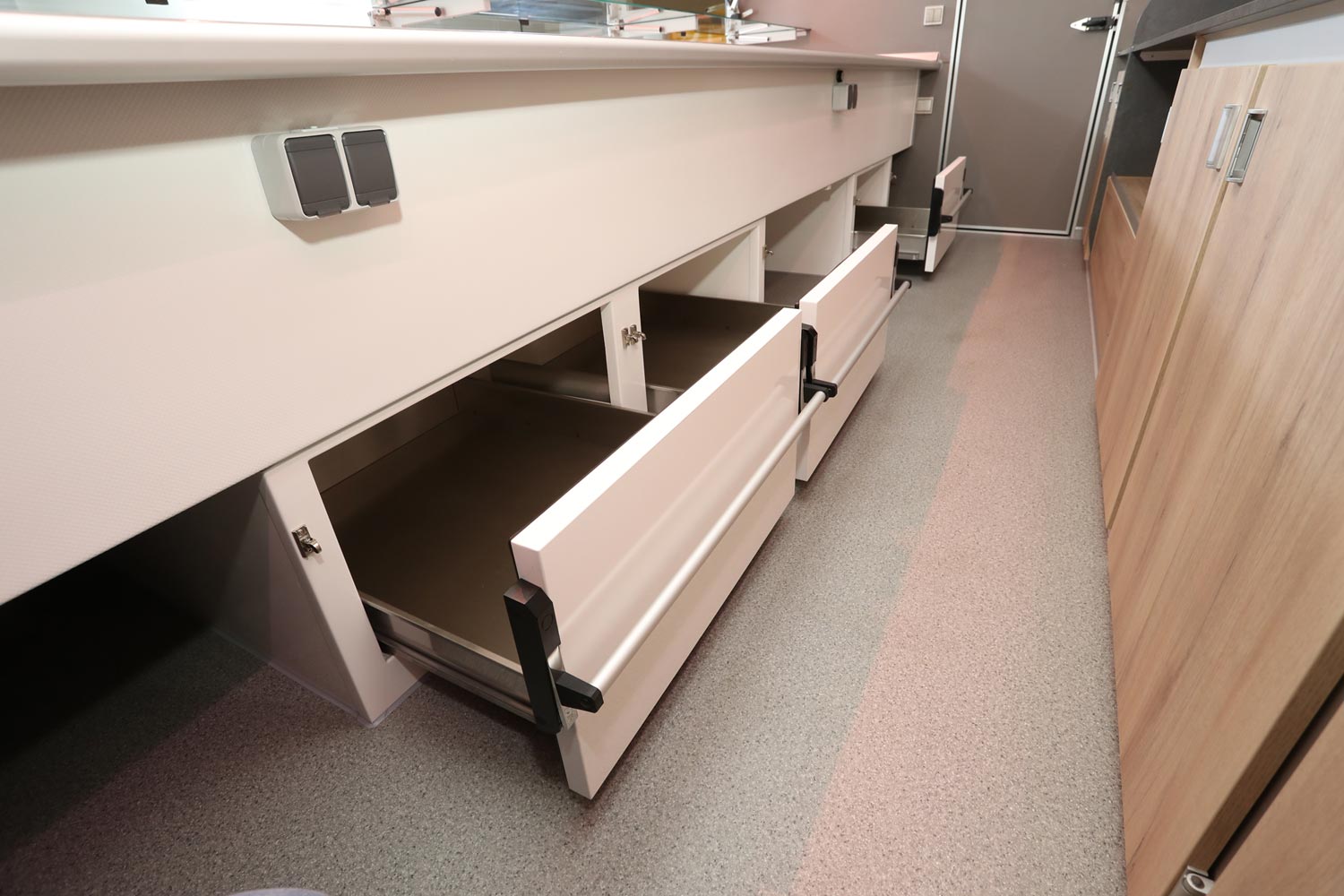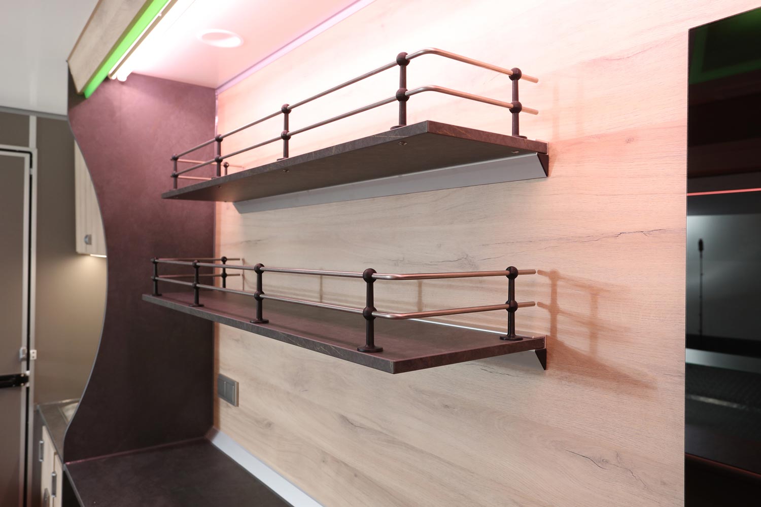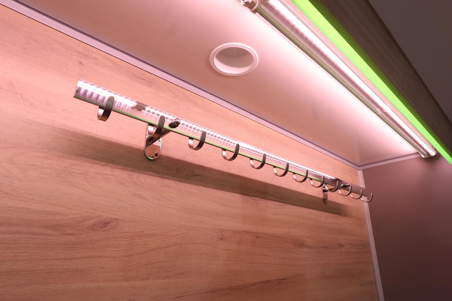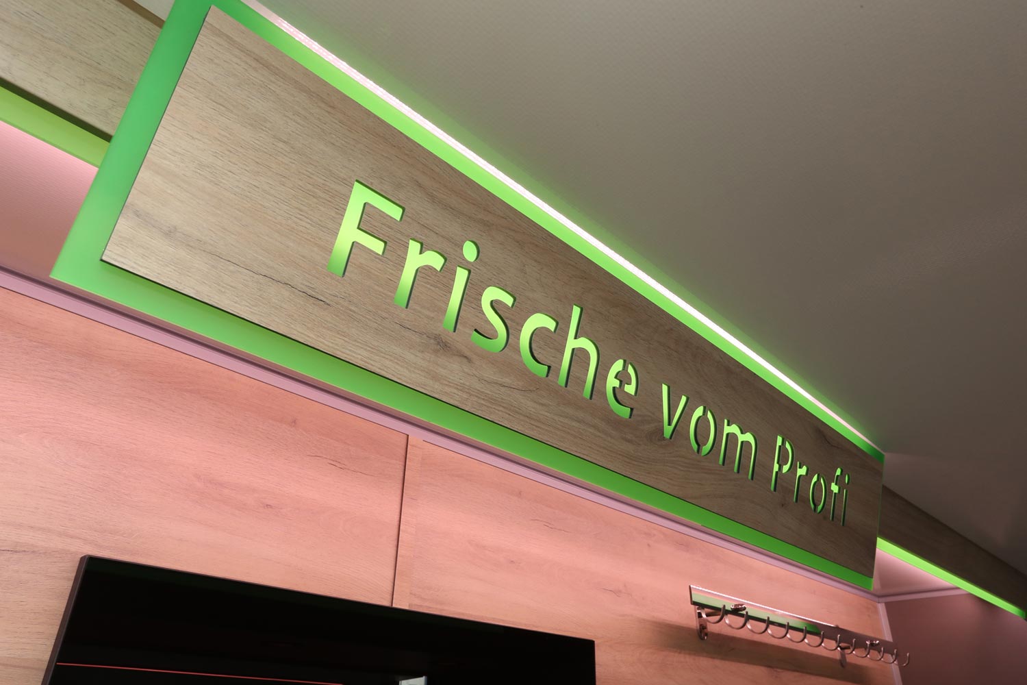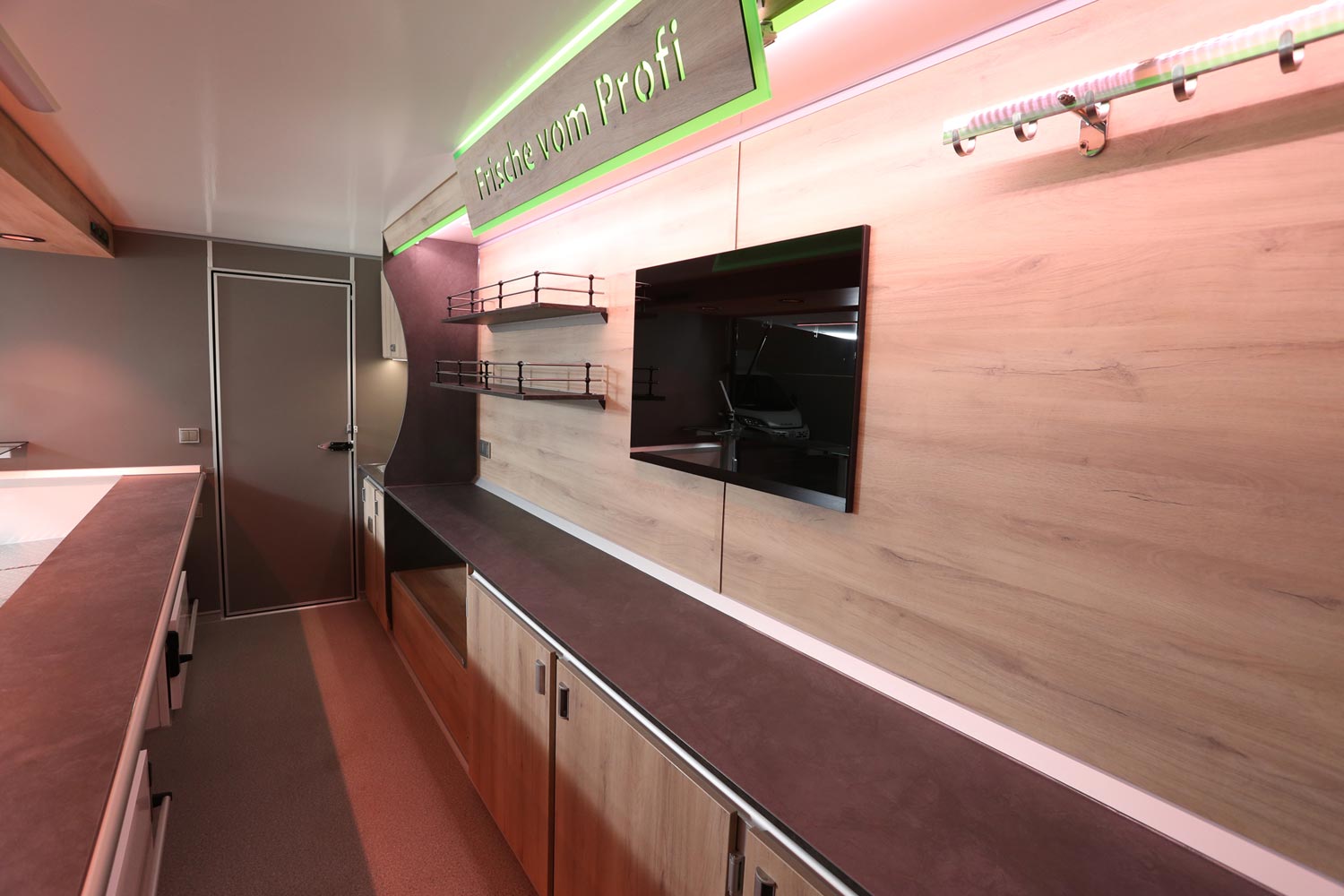 5.000mm Verkaufskühltheke, 3 Kühlauszüge für 6 E-Kisten, Hakenschienen, Wandregal, LED-Beleuchtung, 3 Schränke mit Drehtüren, Glaswerbetafel