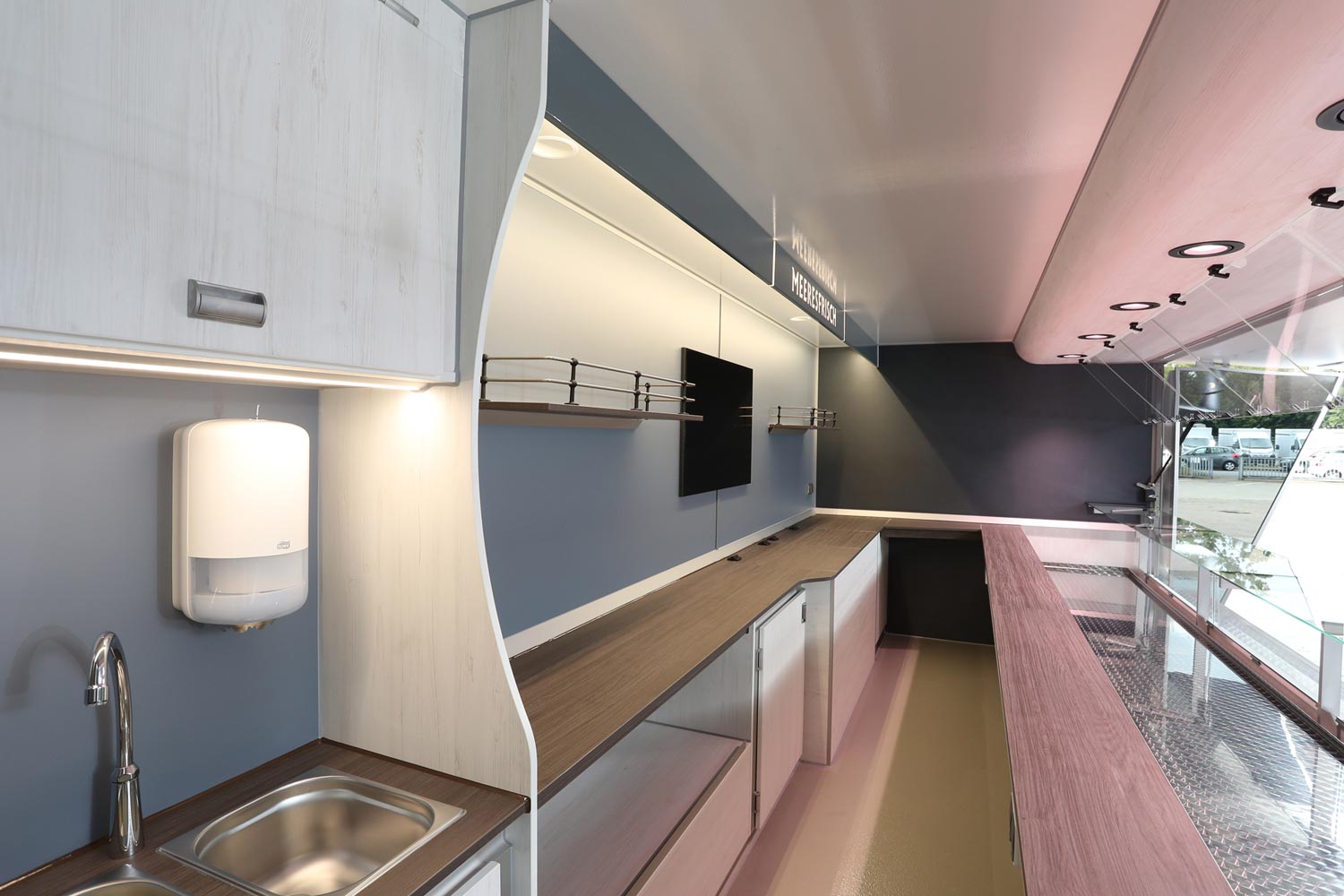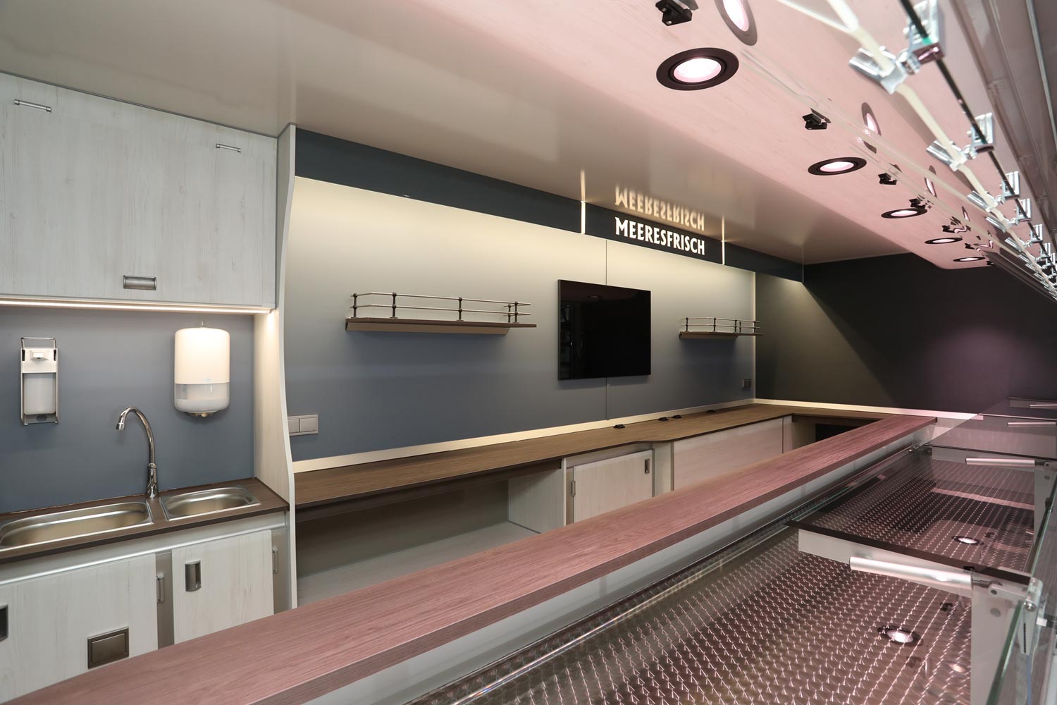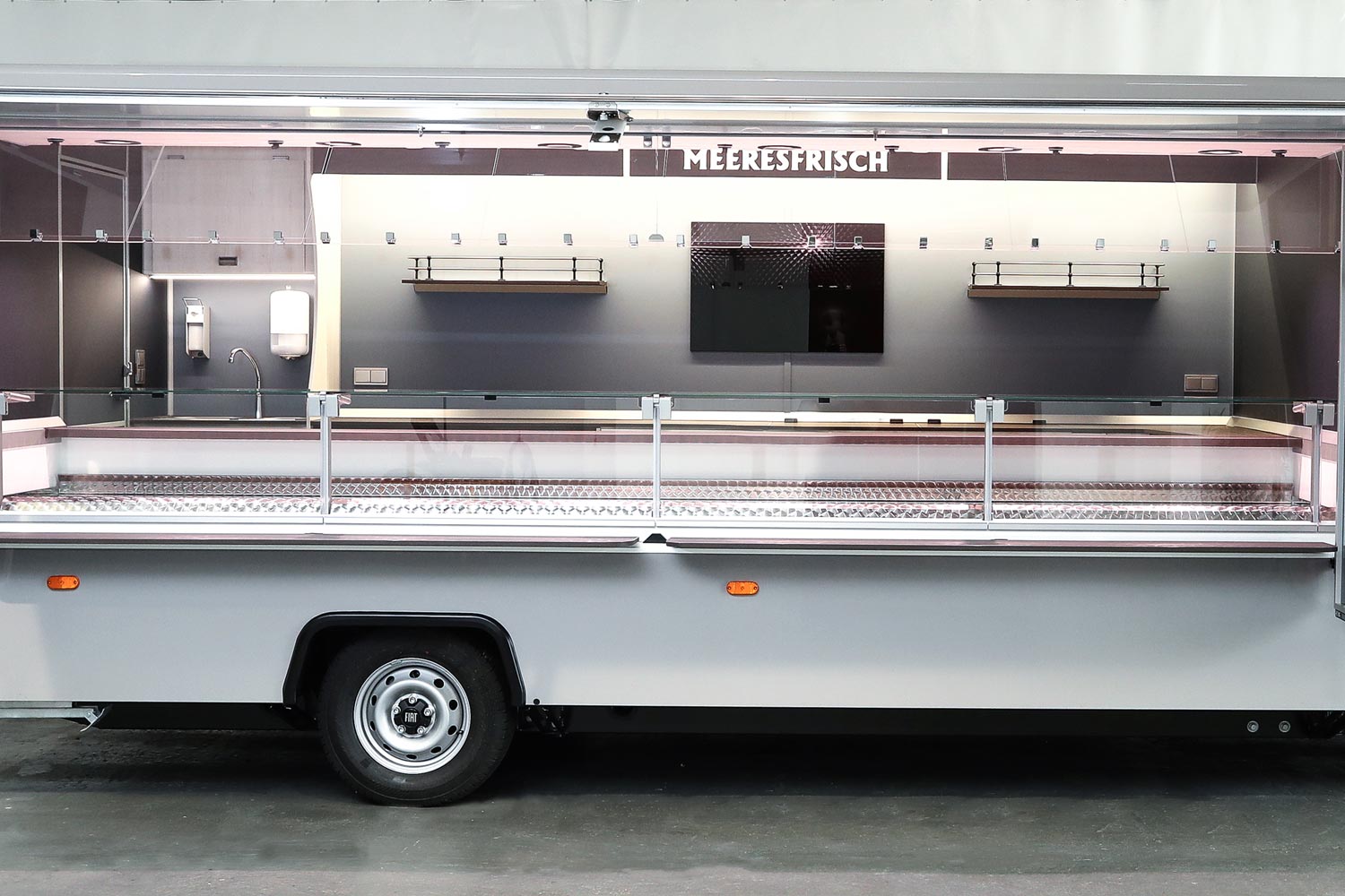 Kühltheke mit Umluftkühlung, Isoliertruhe für E-Kisten, Wandregale, klappbare Windschutzverglasung, Glaswerbetafel  und 400 Volt Stromanschluss.