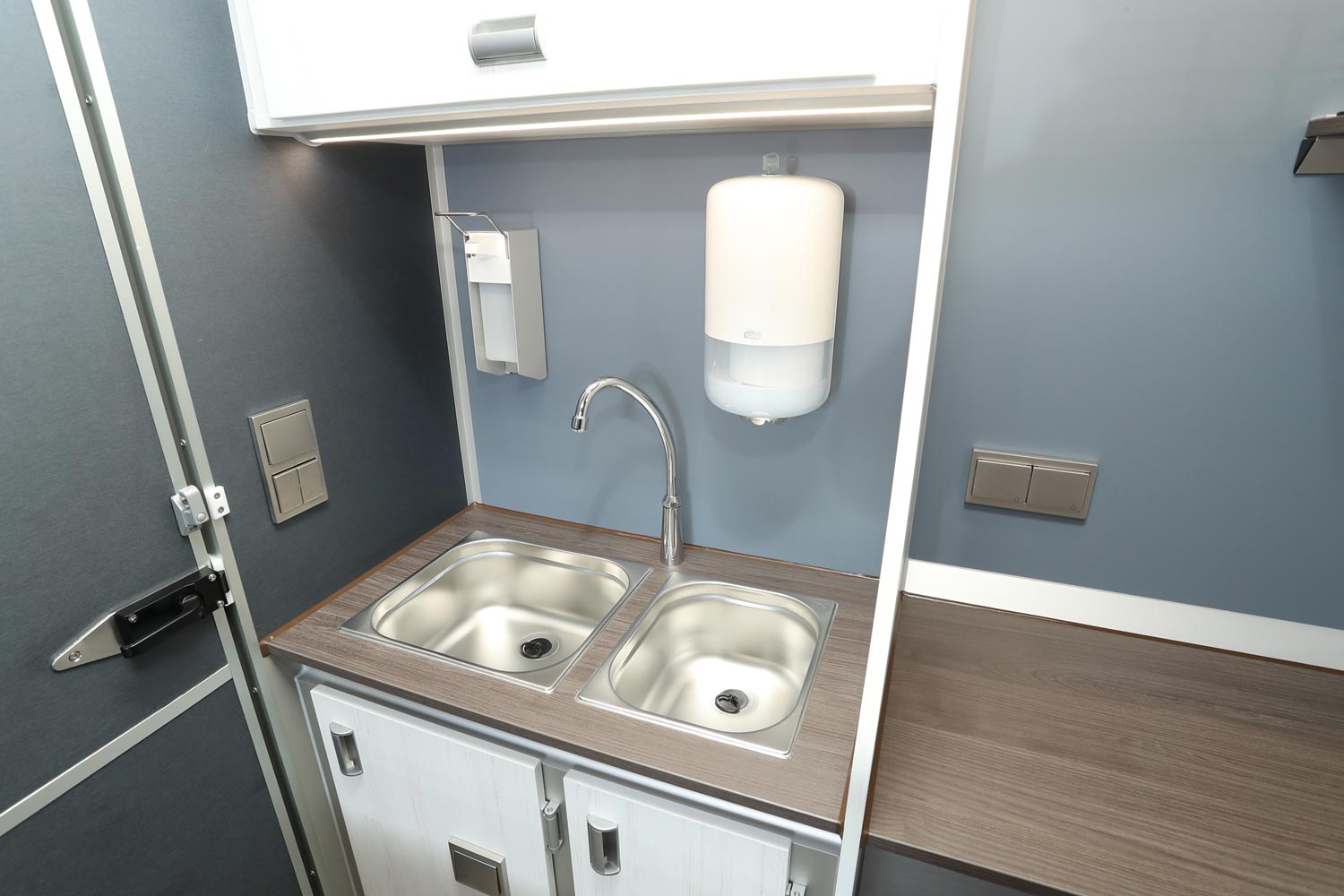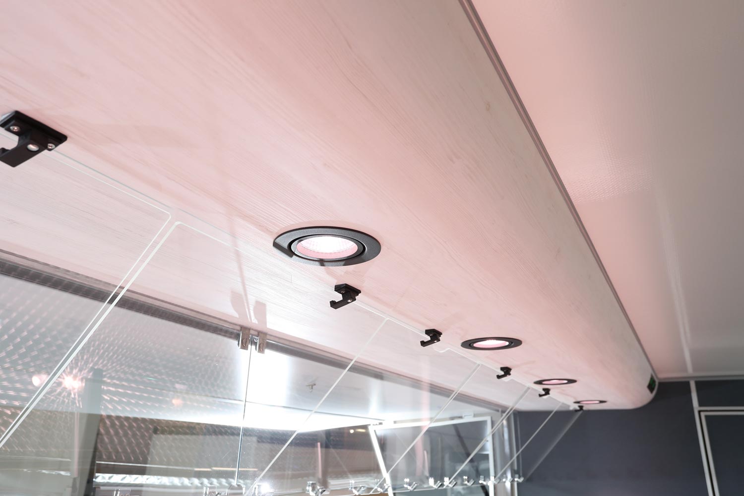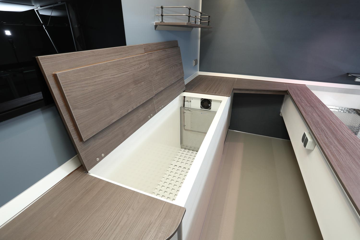 Kühltheke mit Umluftkühlung, Isoliertruhe für E-Kisten, Wandregale, klappbare Windschutzverglasung, Glaswerbetafel  und 400 Volt Stromanschluss.