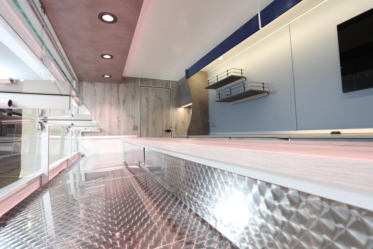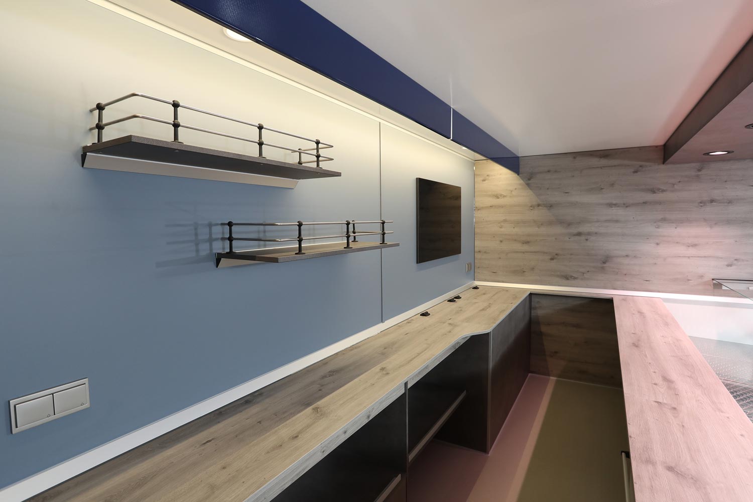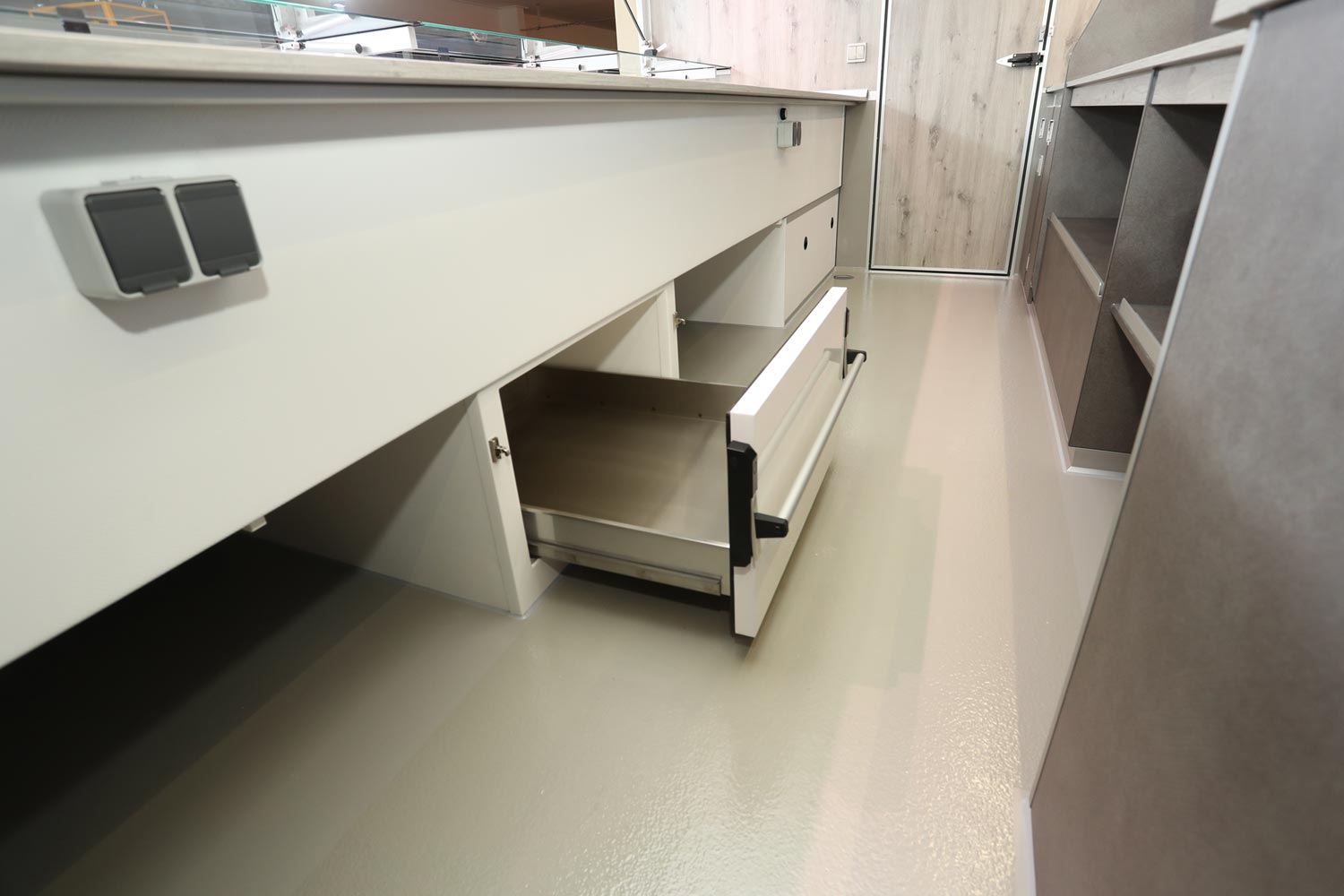 4.500 mm Verkaufskühltheke mit 740mm Auslage, Thekenaufsatz Frontscheiben senkrecht - Thekenaufsatz Warsteiner, Kühlfach - 1 Schublade kugellagergeführt mit Edelstahlwanne, Isoliertruhe für E - Kisten, Kühlanlage ausgelegt für eine Temperaturleistung von 32°C, Waschbeckenhygieneschrank, Glaswerbetafel