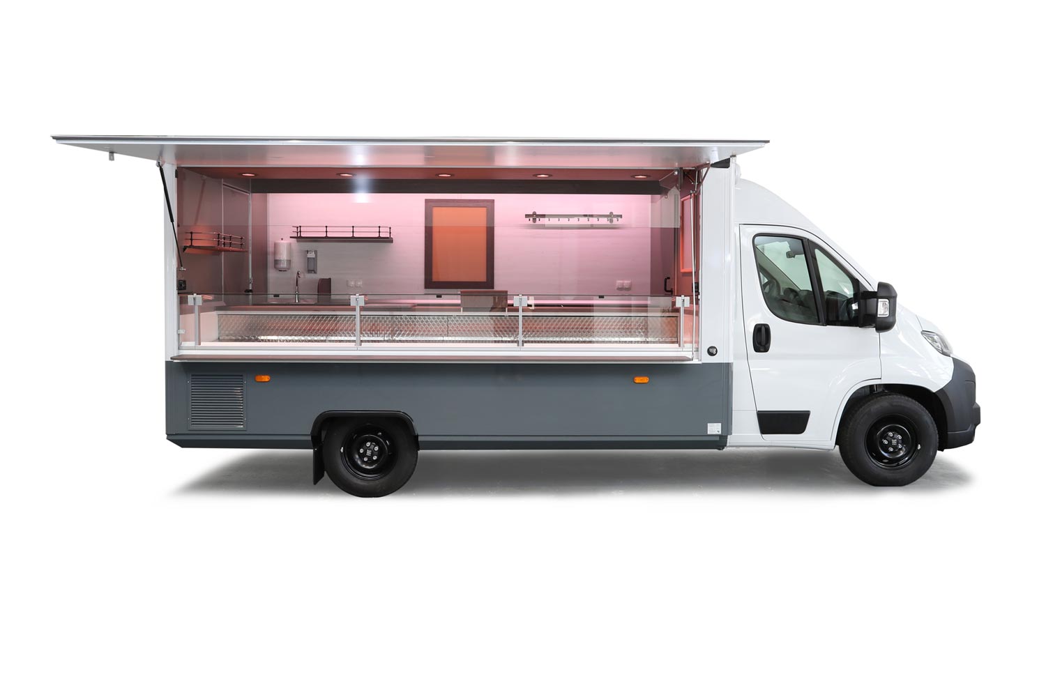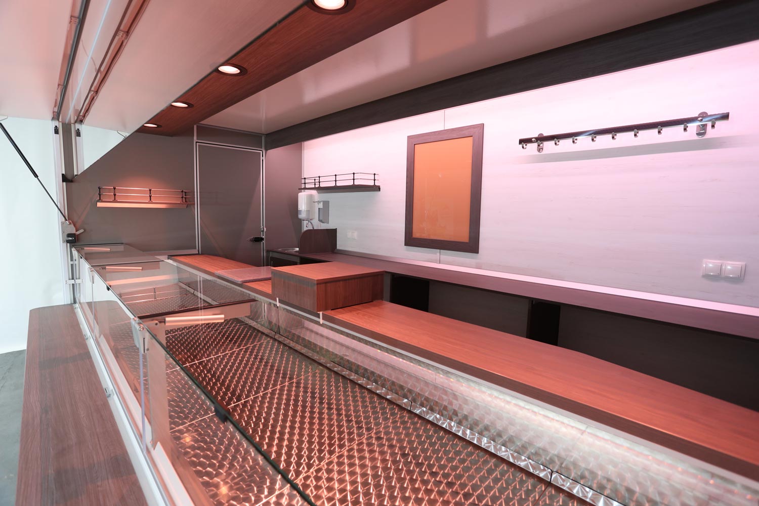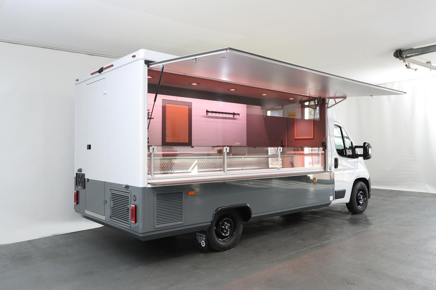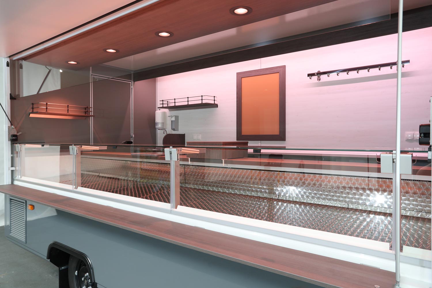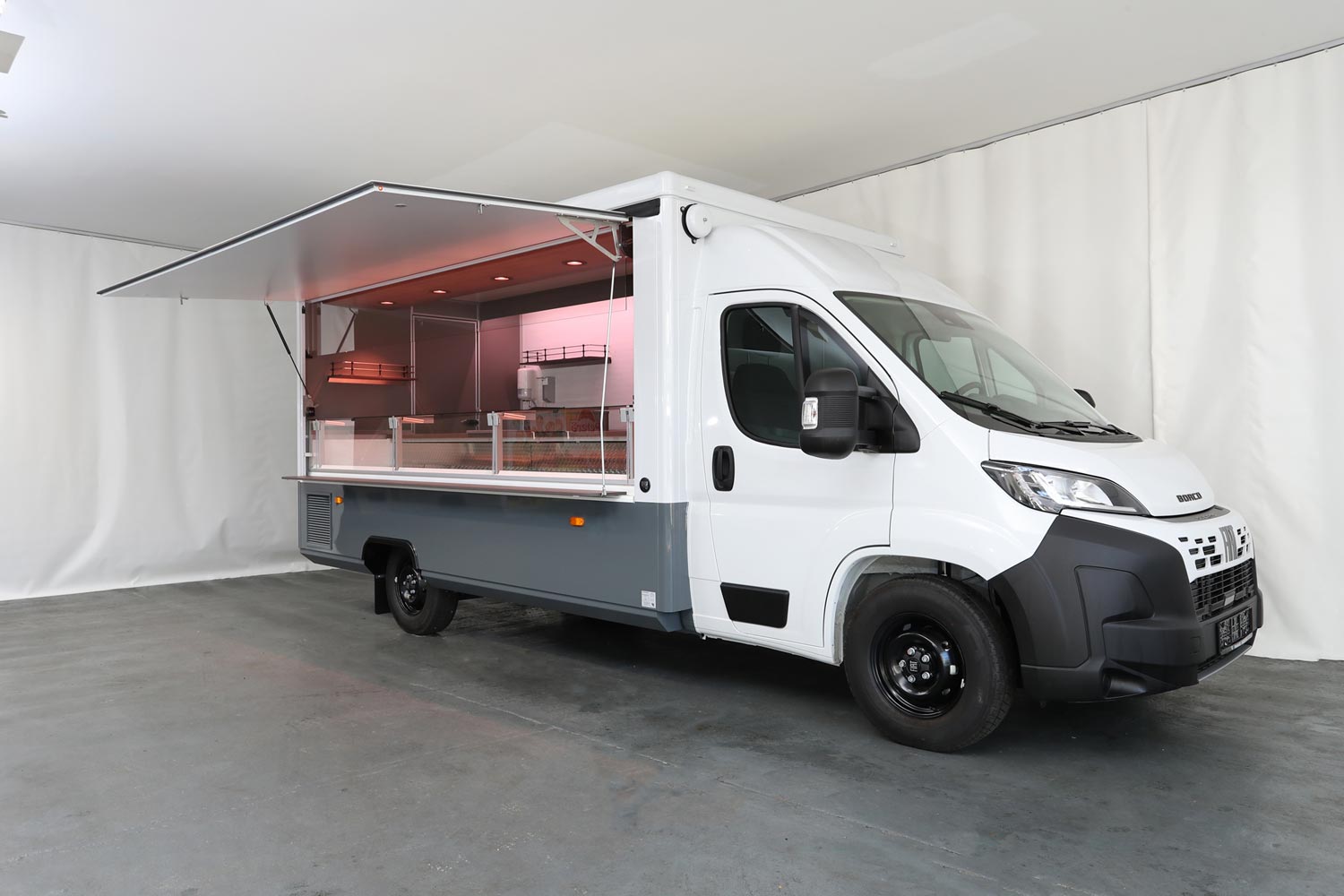 elektrische Klappenöffnung, Kühltheke mit stiller Kühlung, Kühlfach für 2 E-Kisten, moderner eckiger Glasaufsatz, Schneideplatte, Kassenschublade, Durchgang zum Fahrerhaus, Hakenschiene und Außeneinspeisung zum laden der 4 Lithium Batterien.