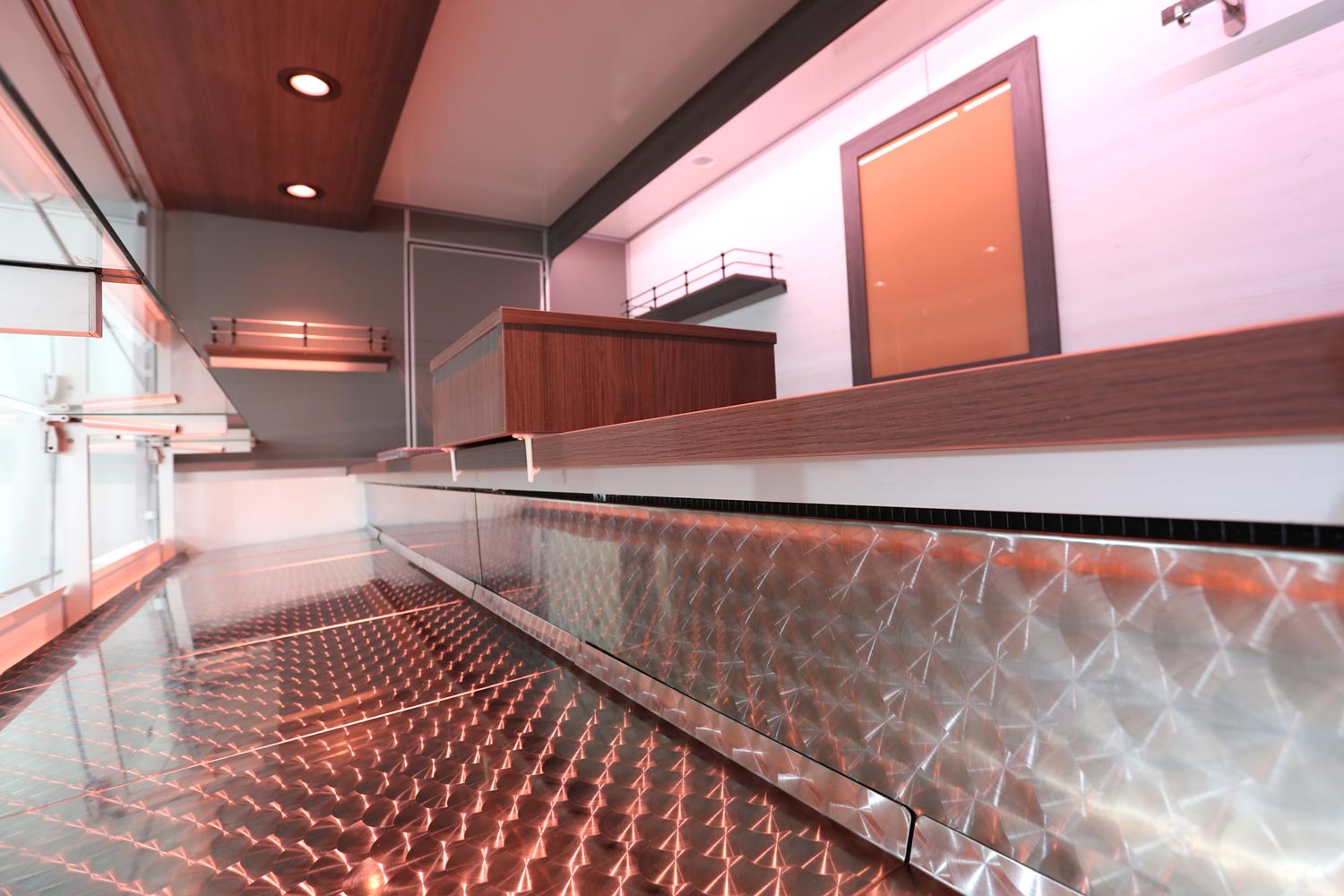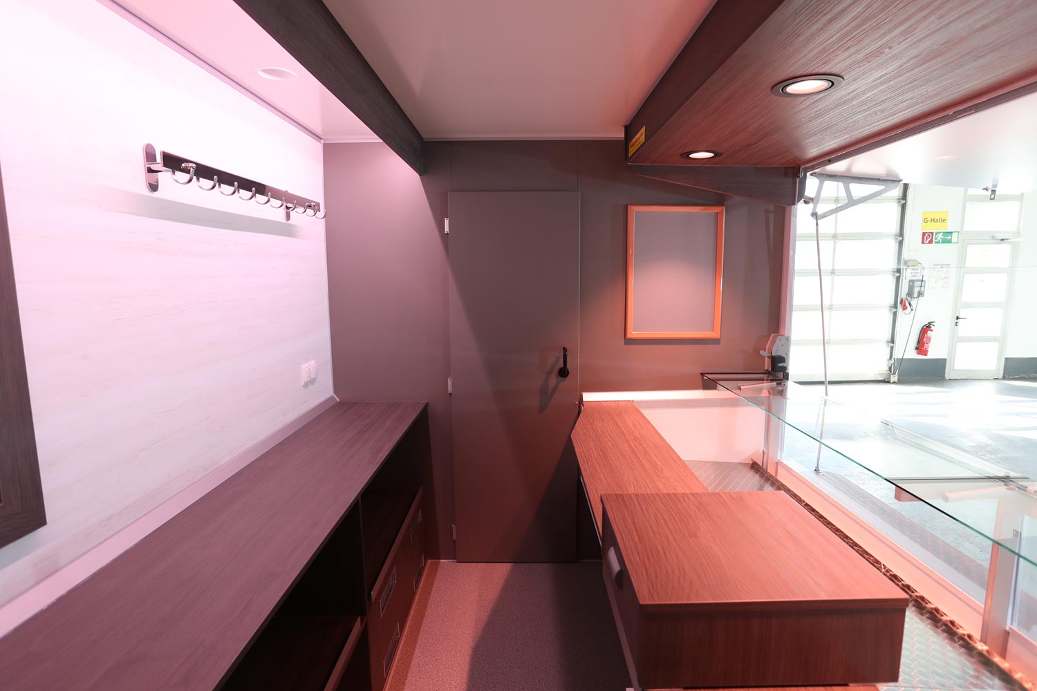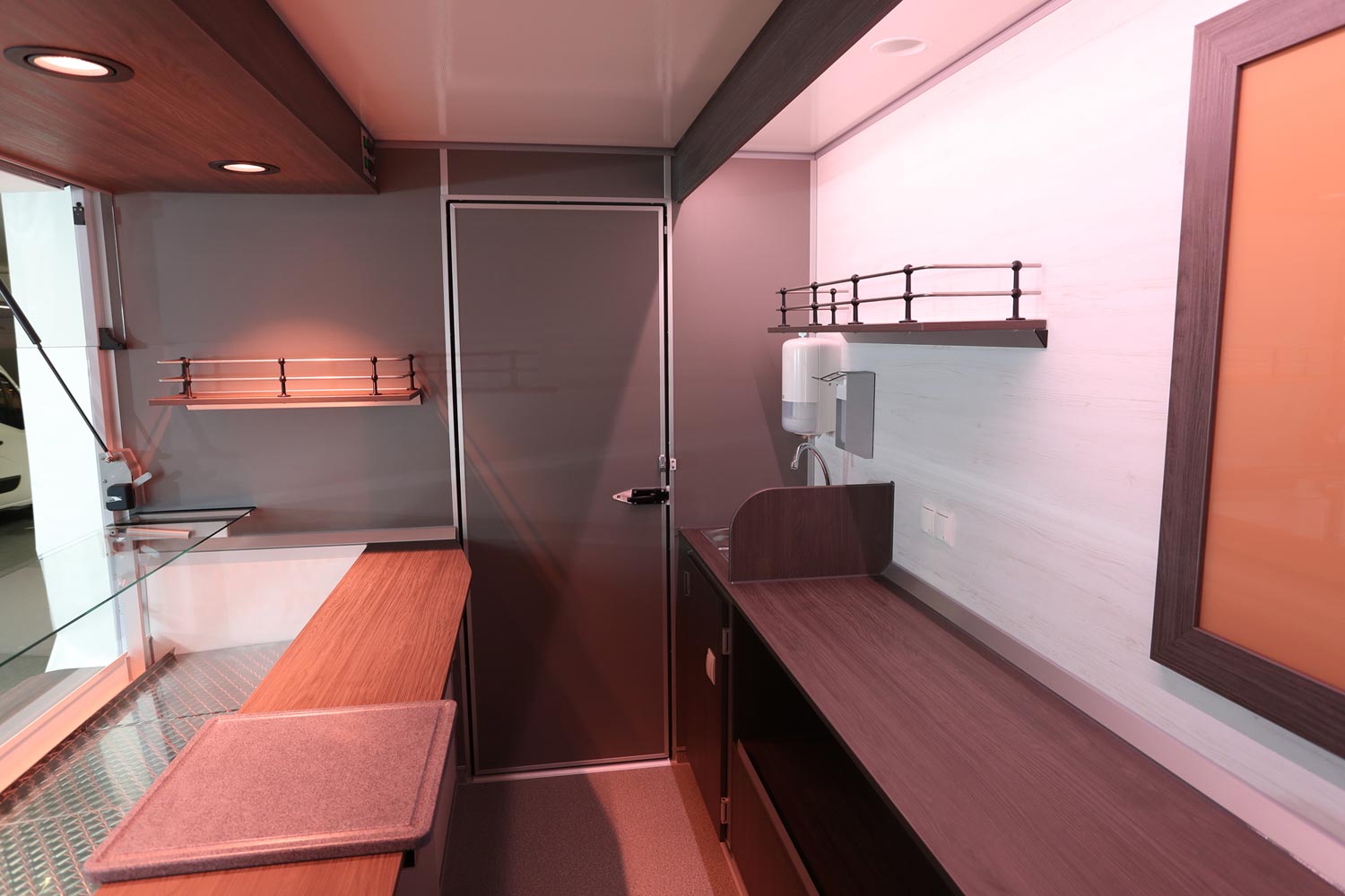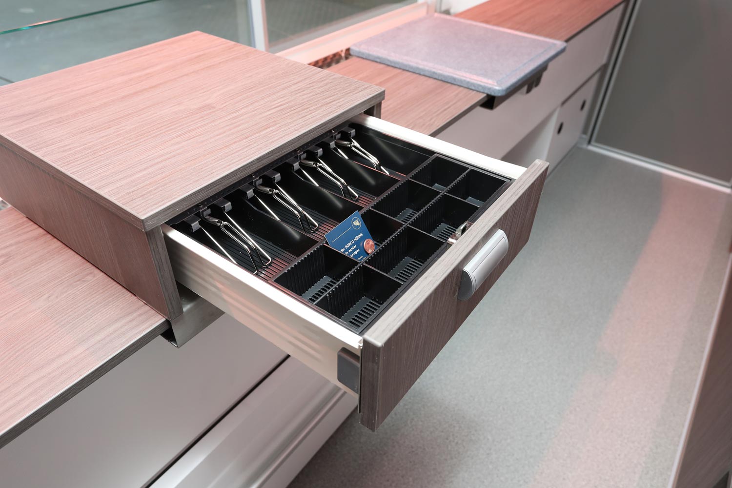 elektrische Klappenöffnung, Kühltheke mit stiller Kühlung, Kühlfach für 2 E-Kisten, moderner eckiger Glasaufsatz, Schneideplatte, Kassenschublade, Durchgang zum Fahrerhaus, Hakenschiene und Außeneinspeisung zum laden der 4 Lithium Batterien.