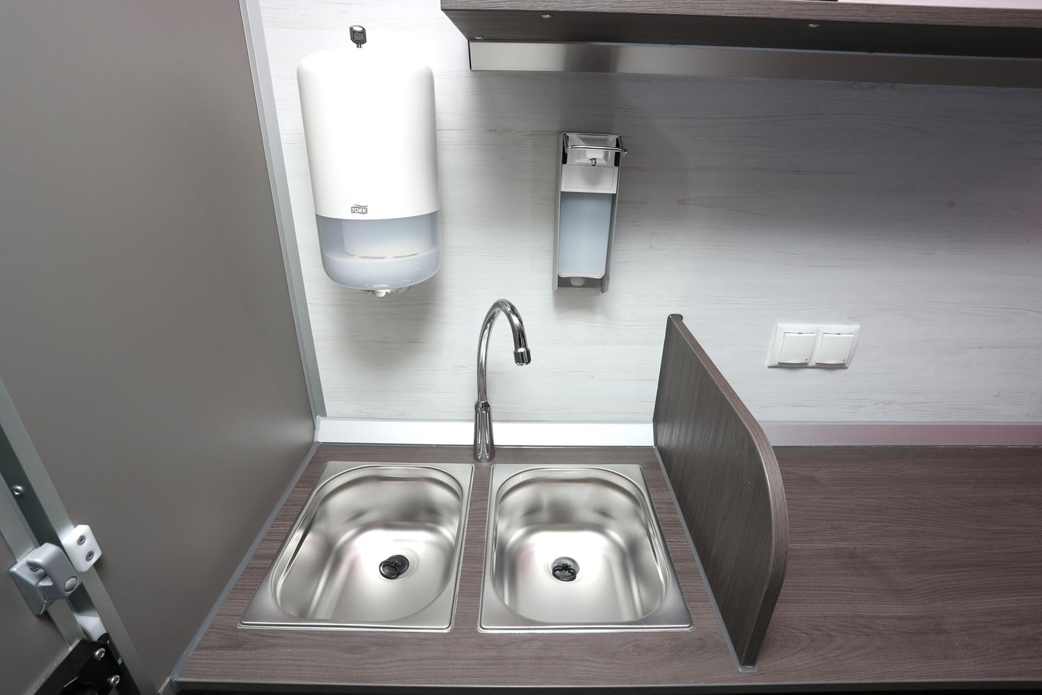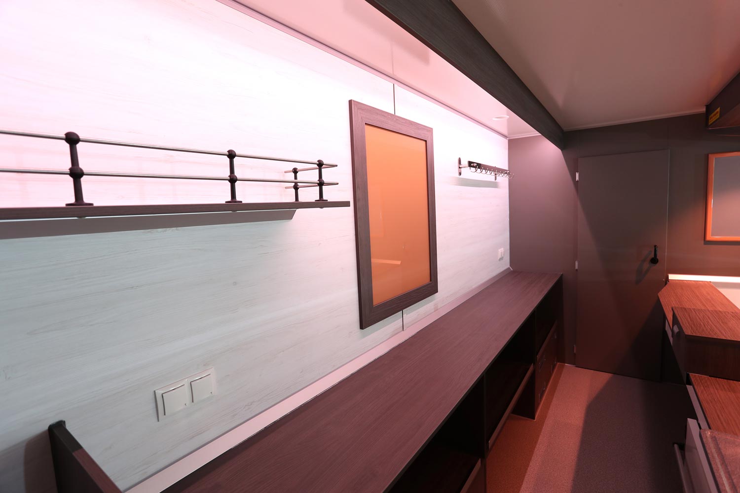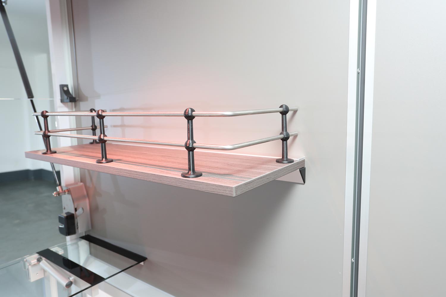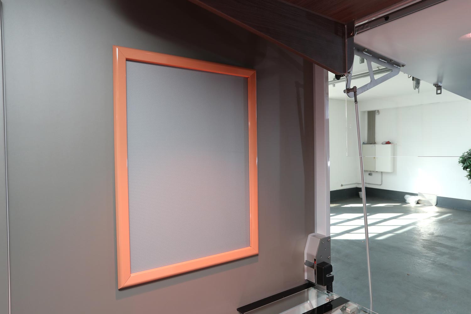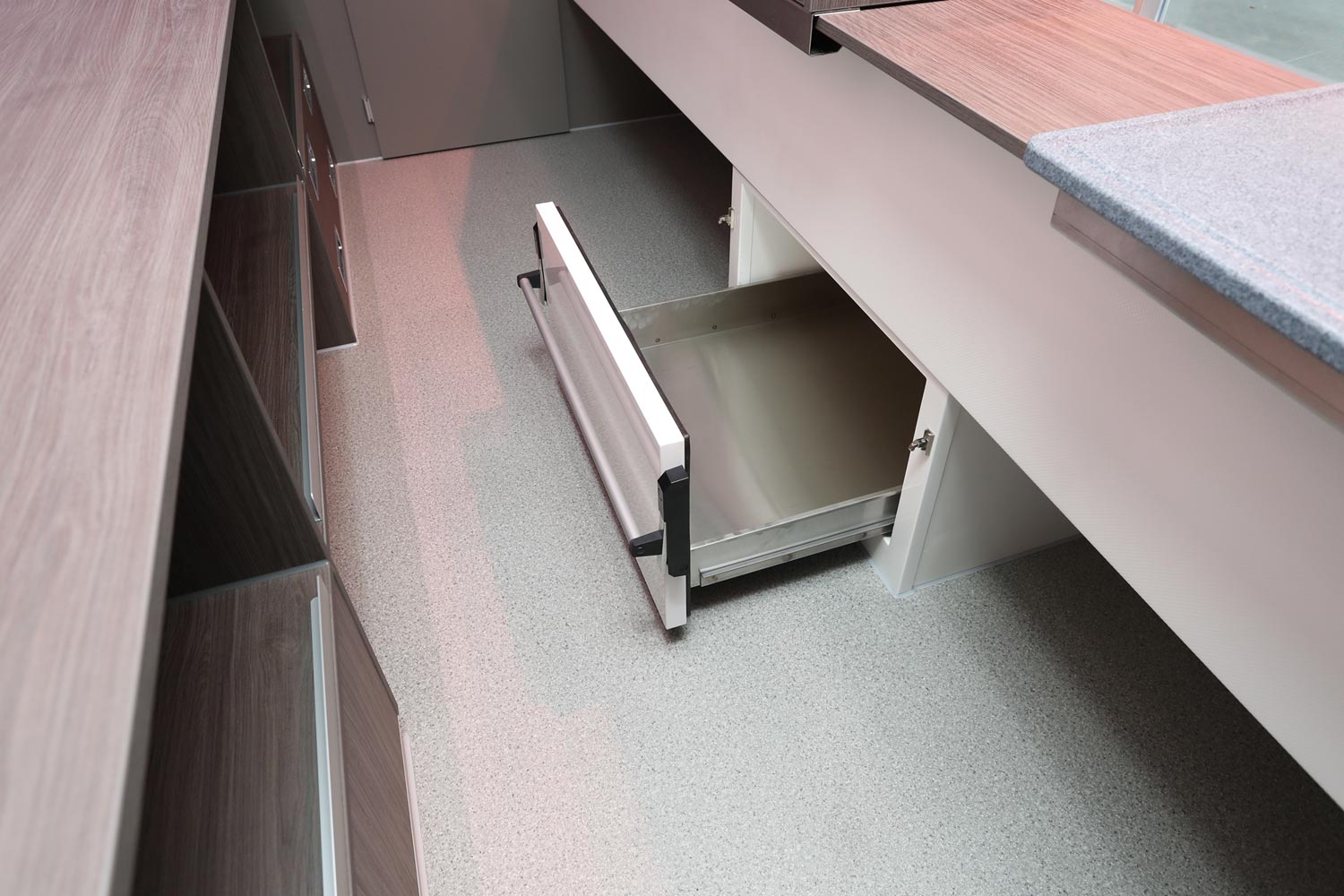 elektrische Klappenöffnung, Kühltheke mit stiller Kühlung, Kühlfach für 2 E-Kisten, moderner eckiger Glasaufsatz, Schneideplatte, Kassenschublade, Durchgang zum Fahrerhaus, Hakenschiene und Außeneinspeisung zum laden der 4 Lithium Batterien.