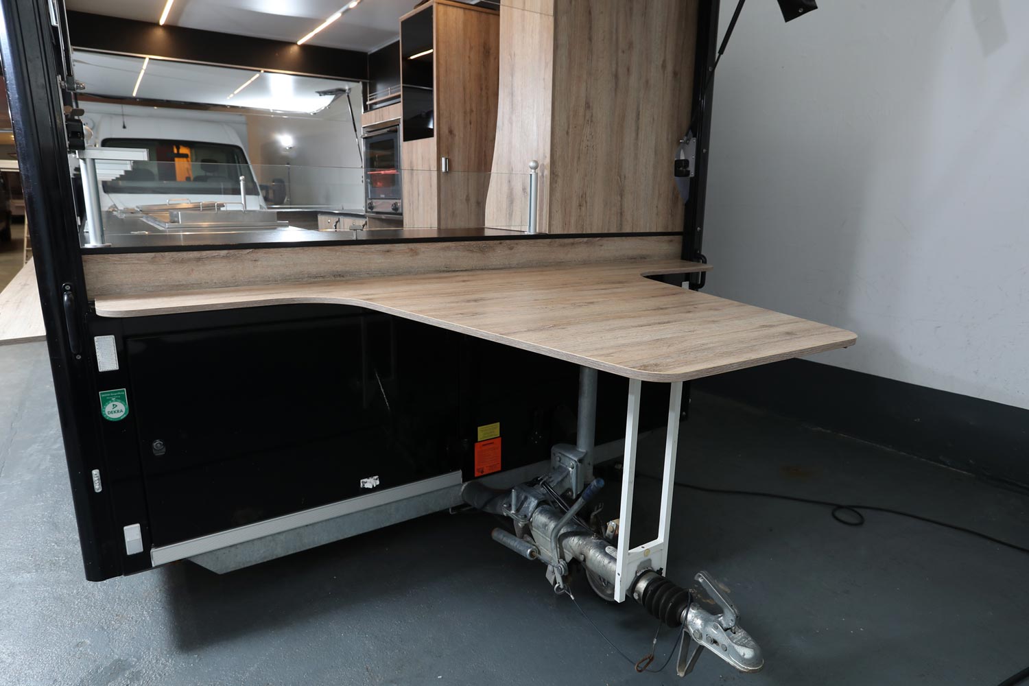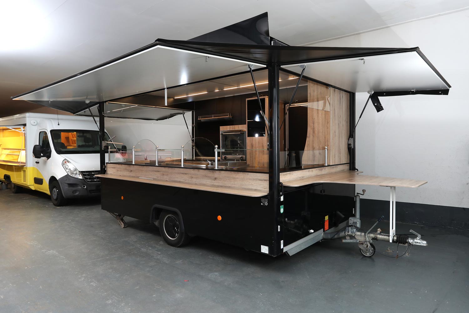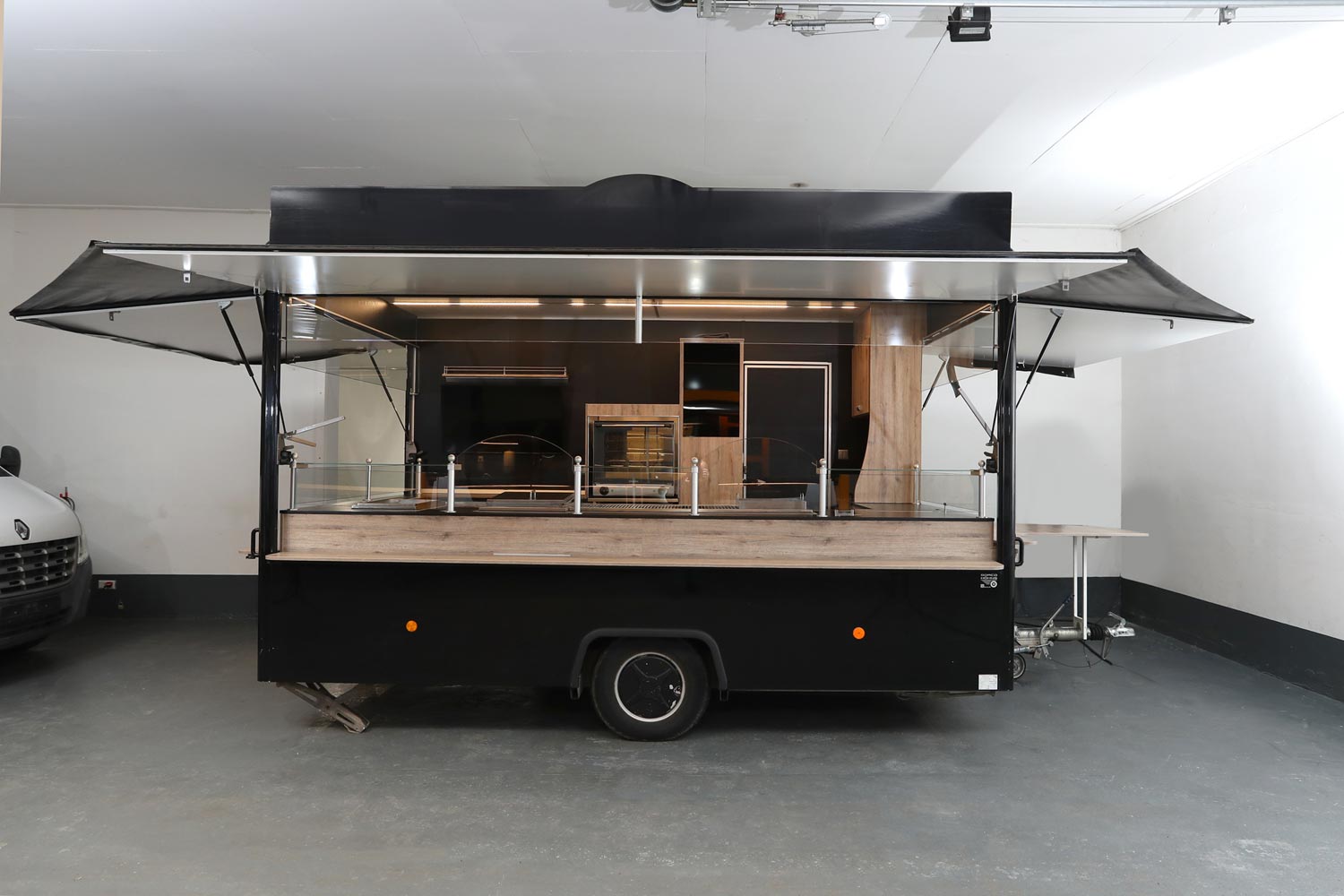 Gepflegter Imbißanhänger mit kleiner Front am Dach.