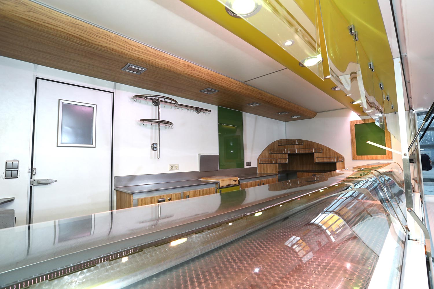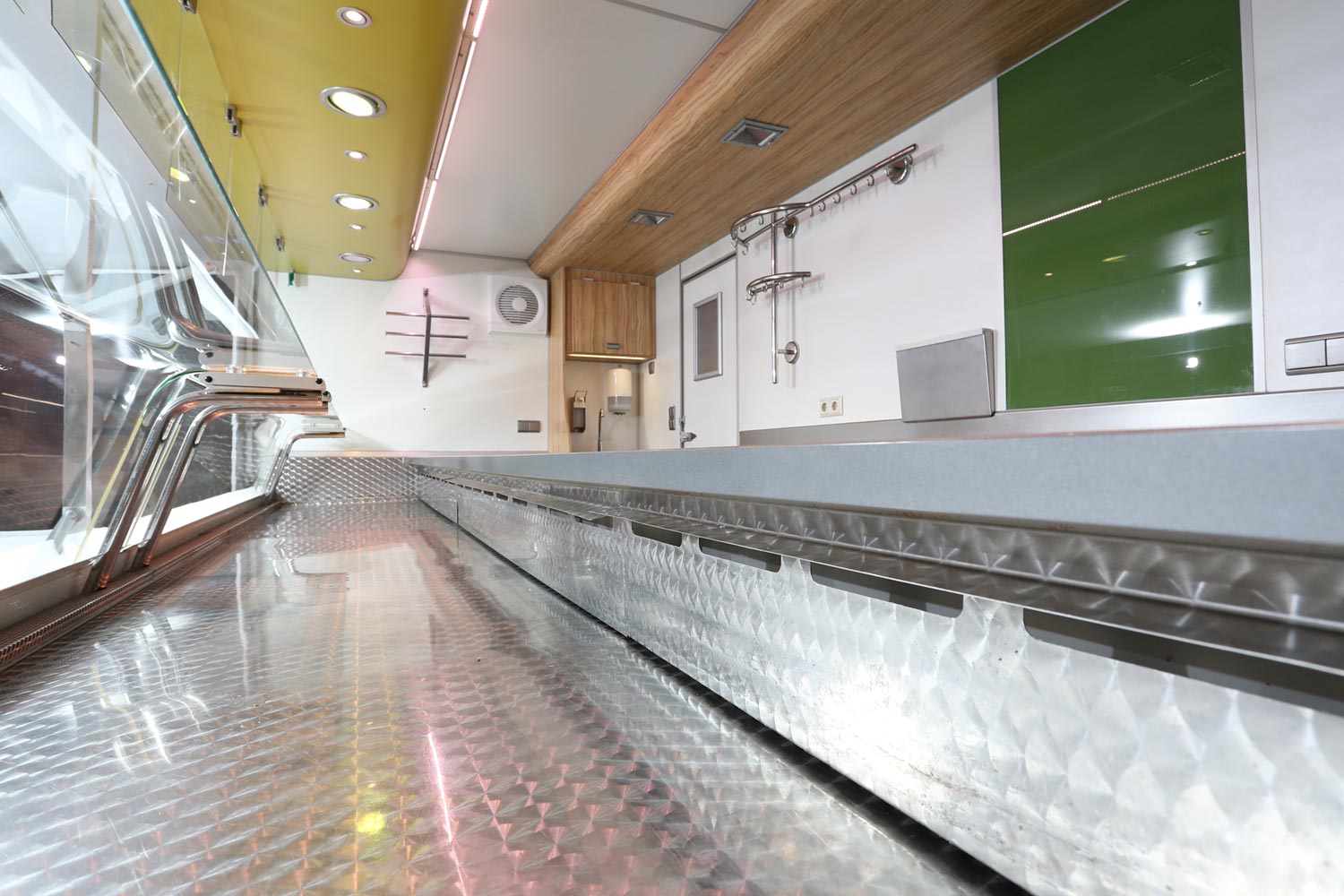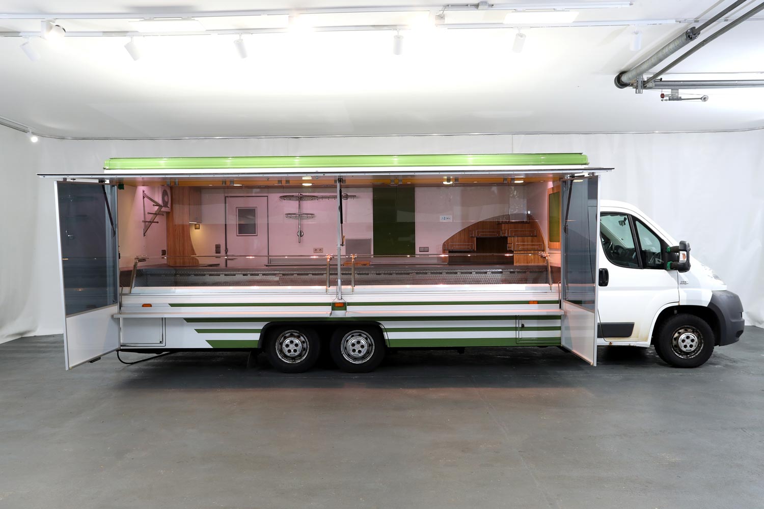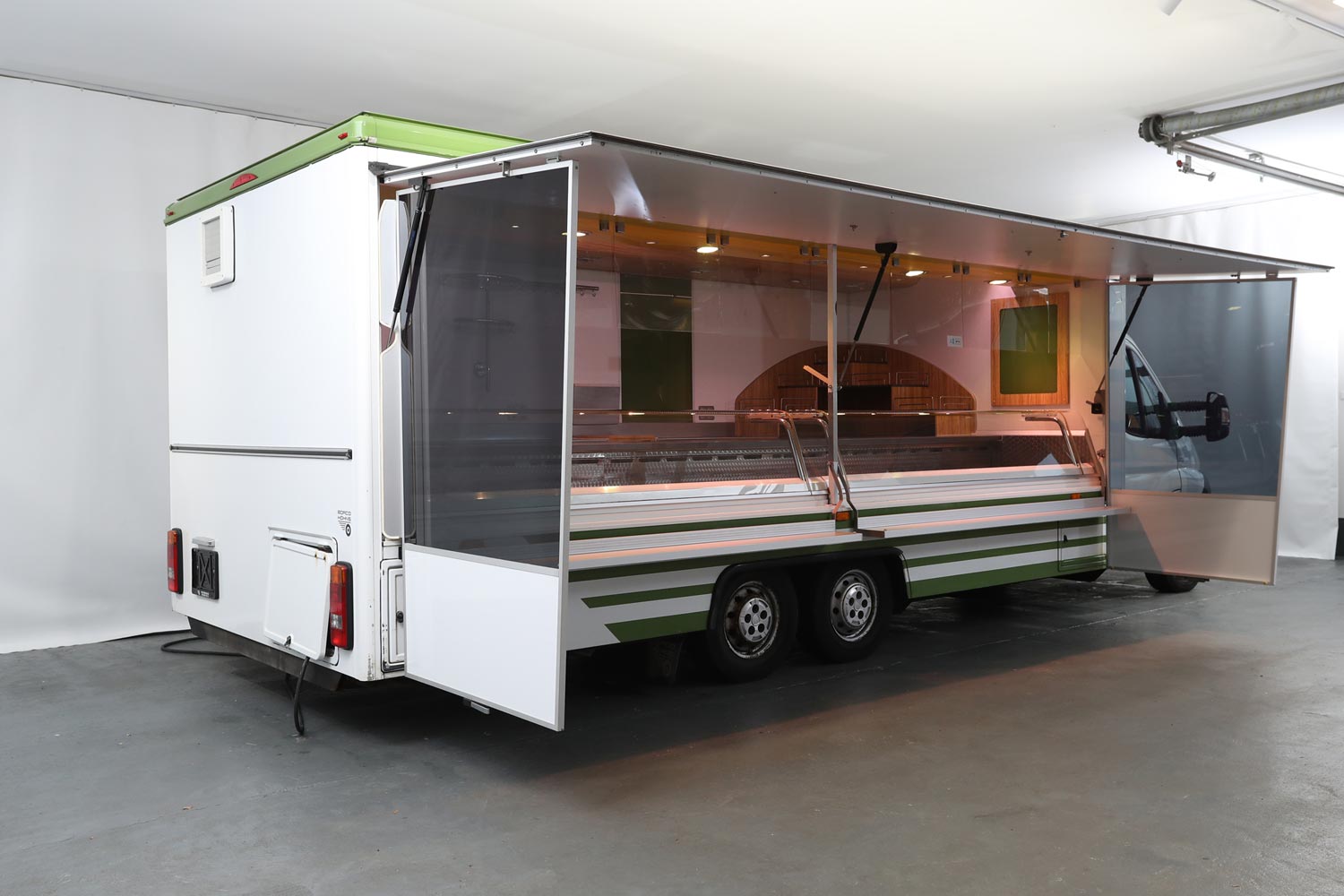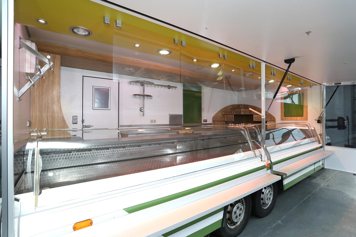 Wochenmarkt-Verkaufsmobil mit Umluft-Kühltheke und Warenpräsentationstreppe.