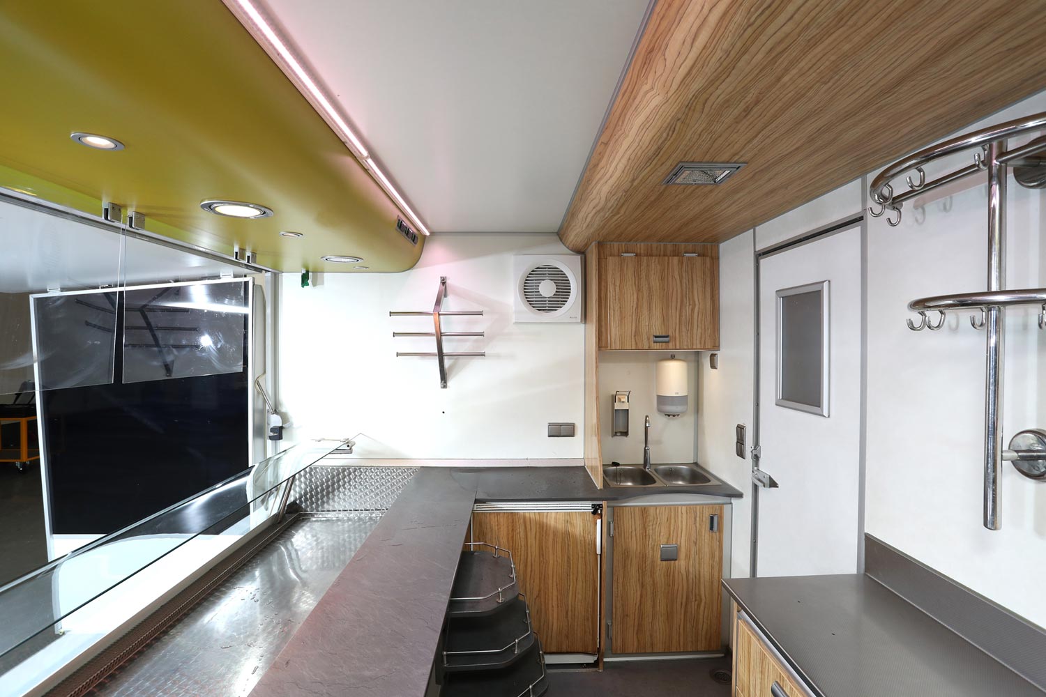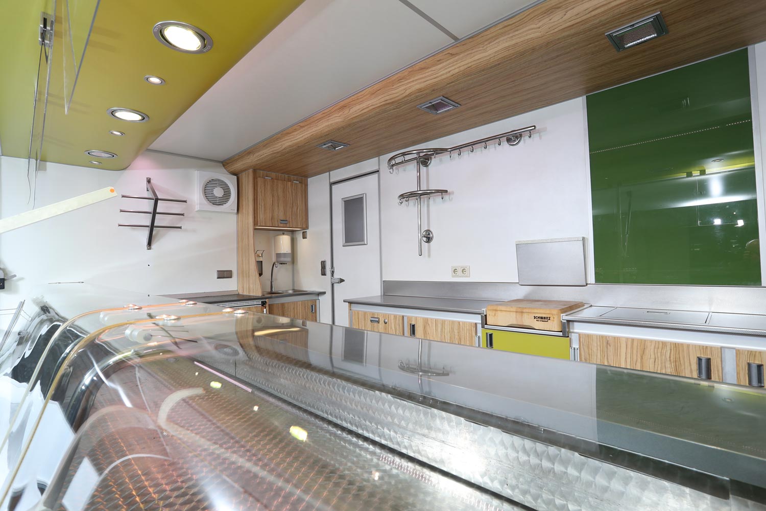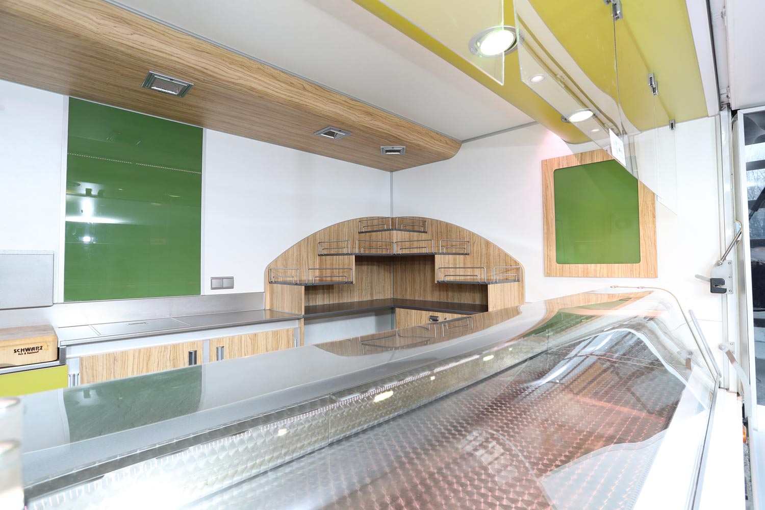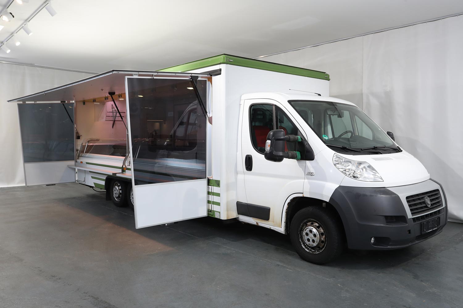 Wochenmarkt-Verkaufsmobil mit Umluft-Kühltheke und Warenpräsentationstreppe.
