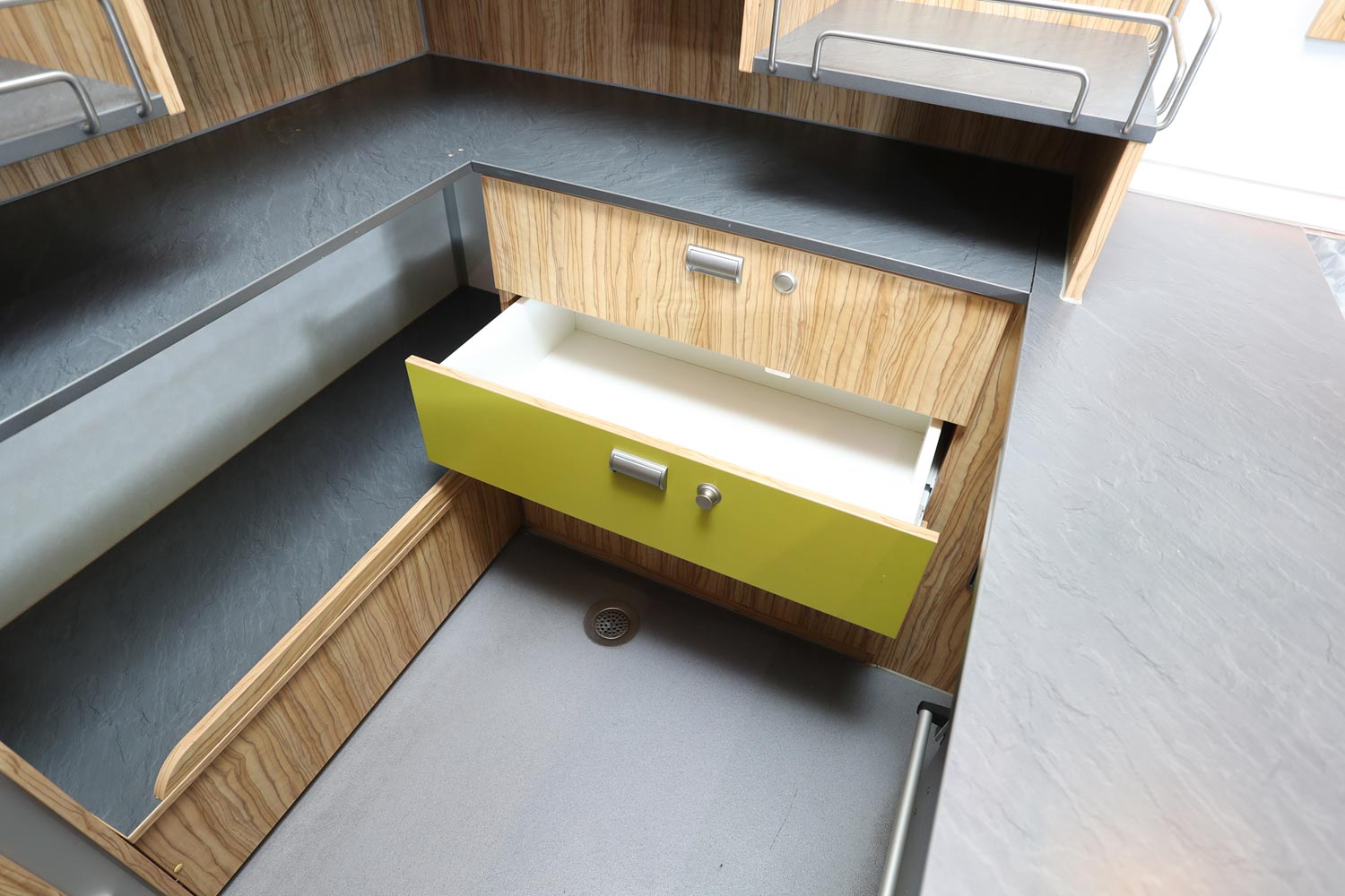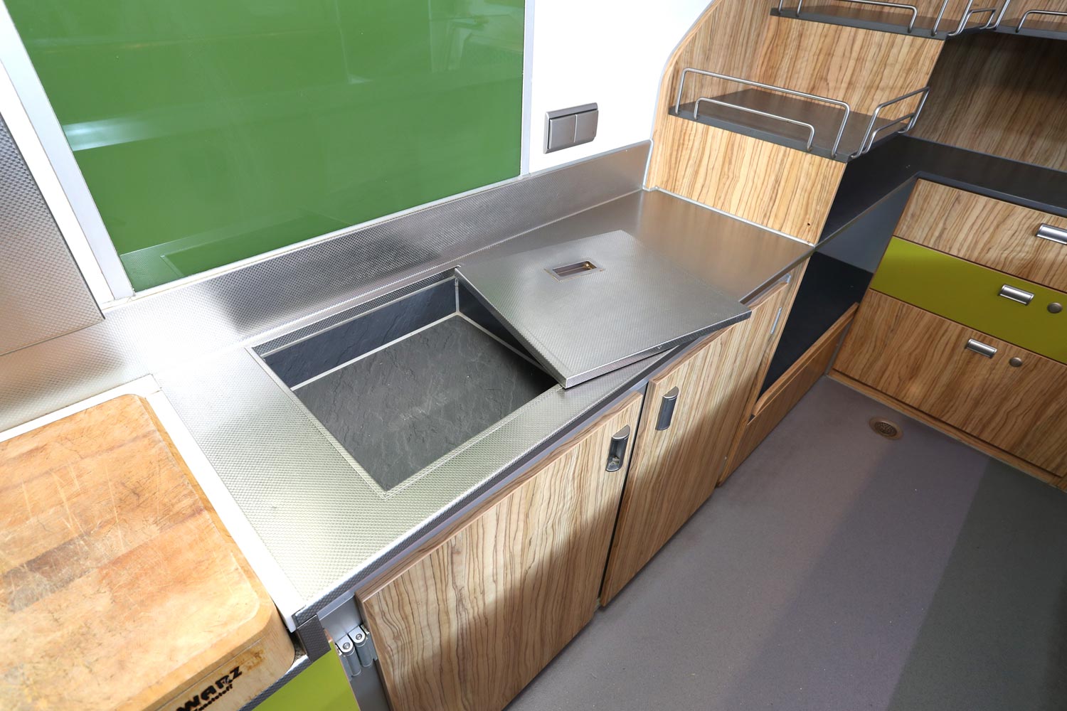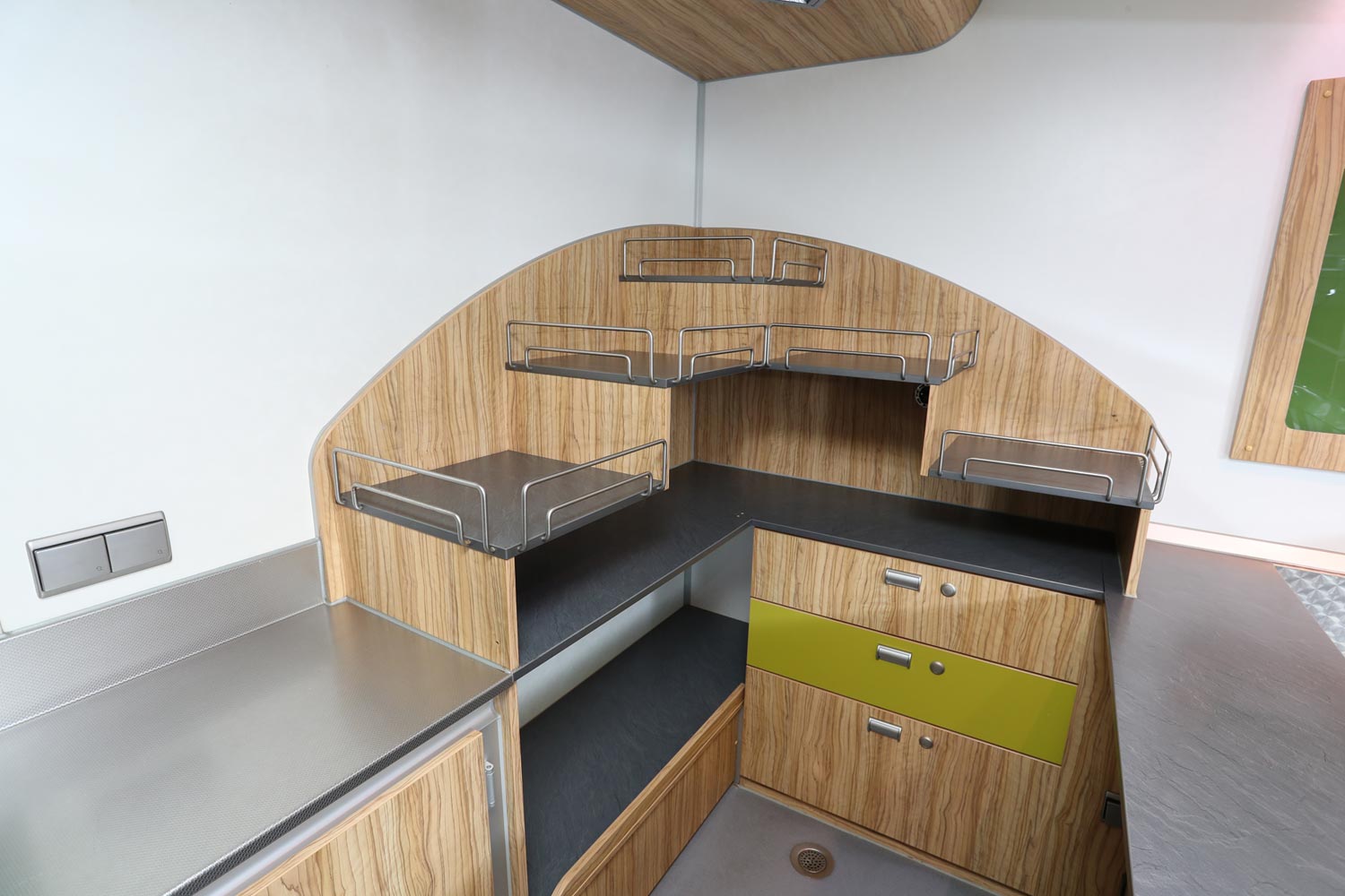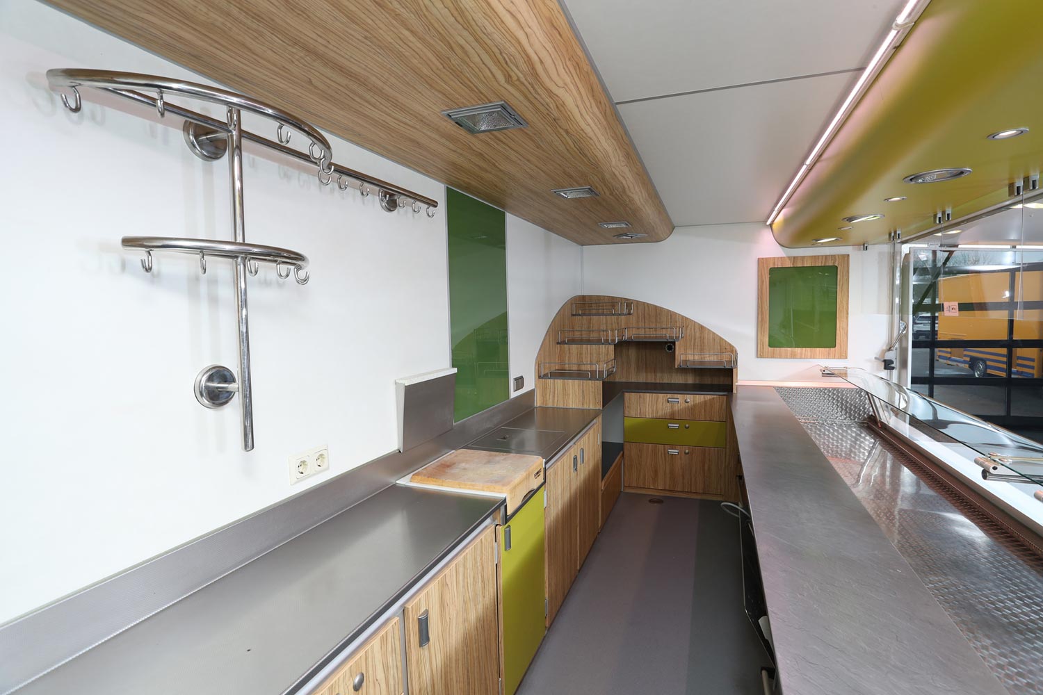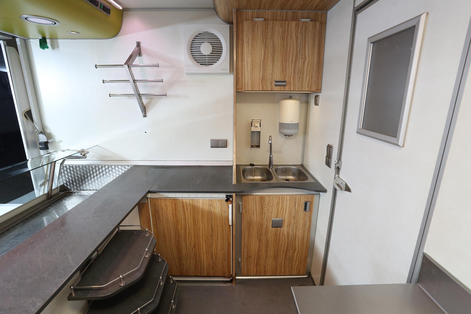 Wochenmarkt-Verkaufsmobil mit Umluft-Kühltheke und Warenpräsentationstreppe.