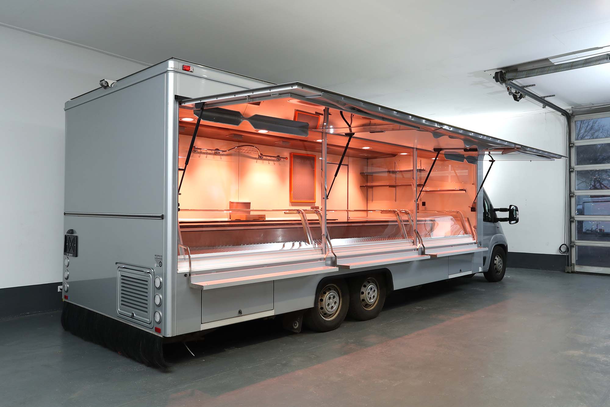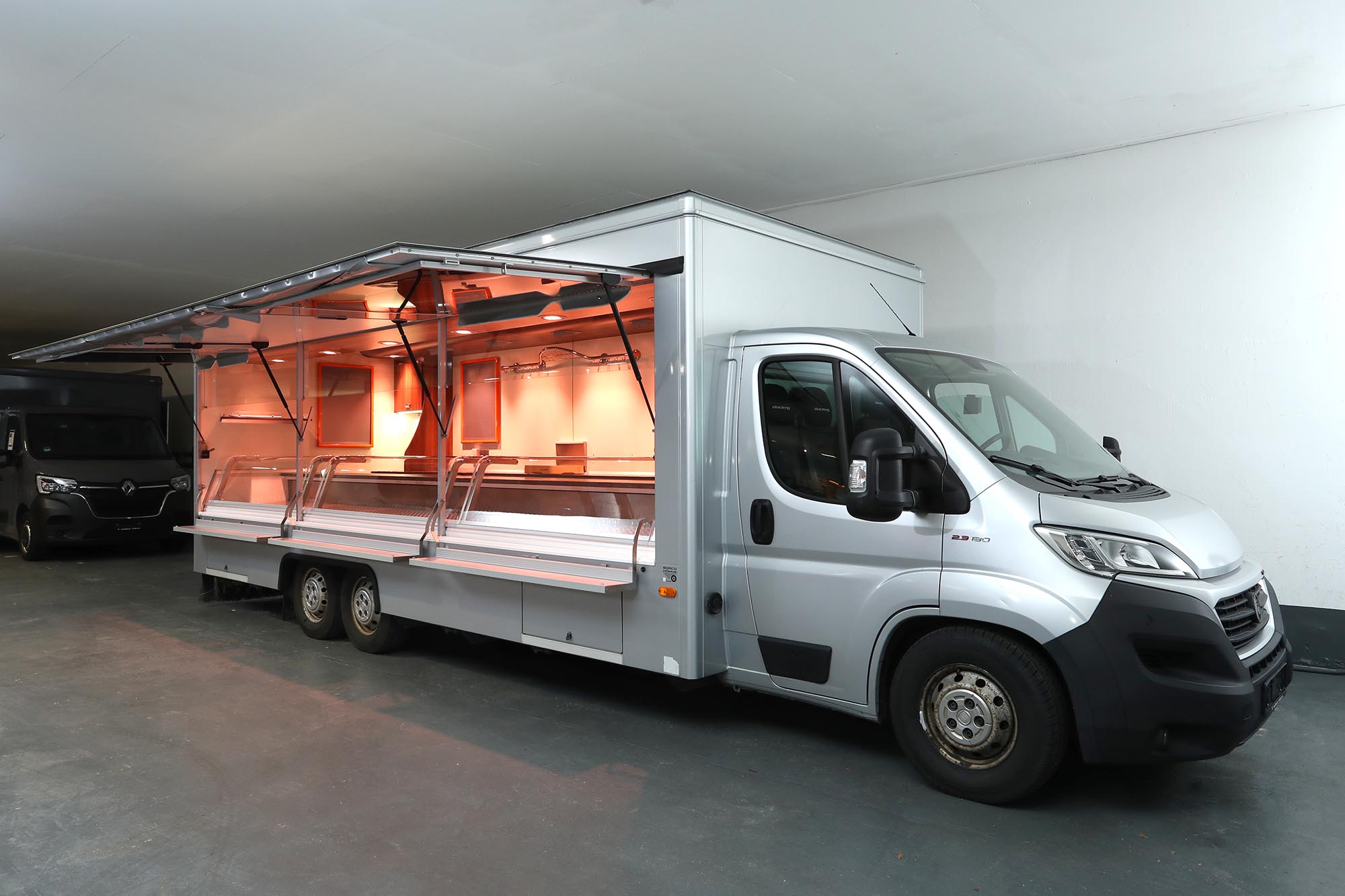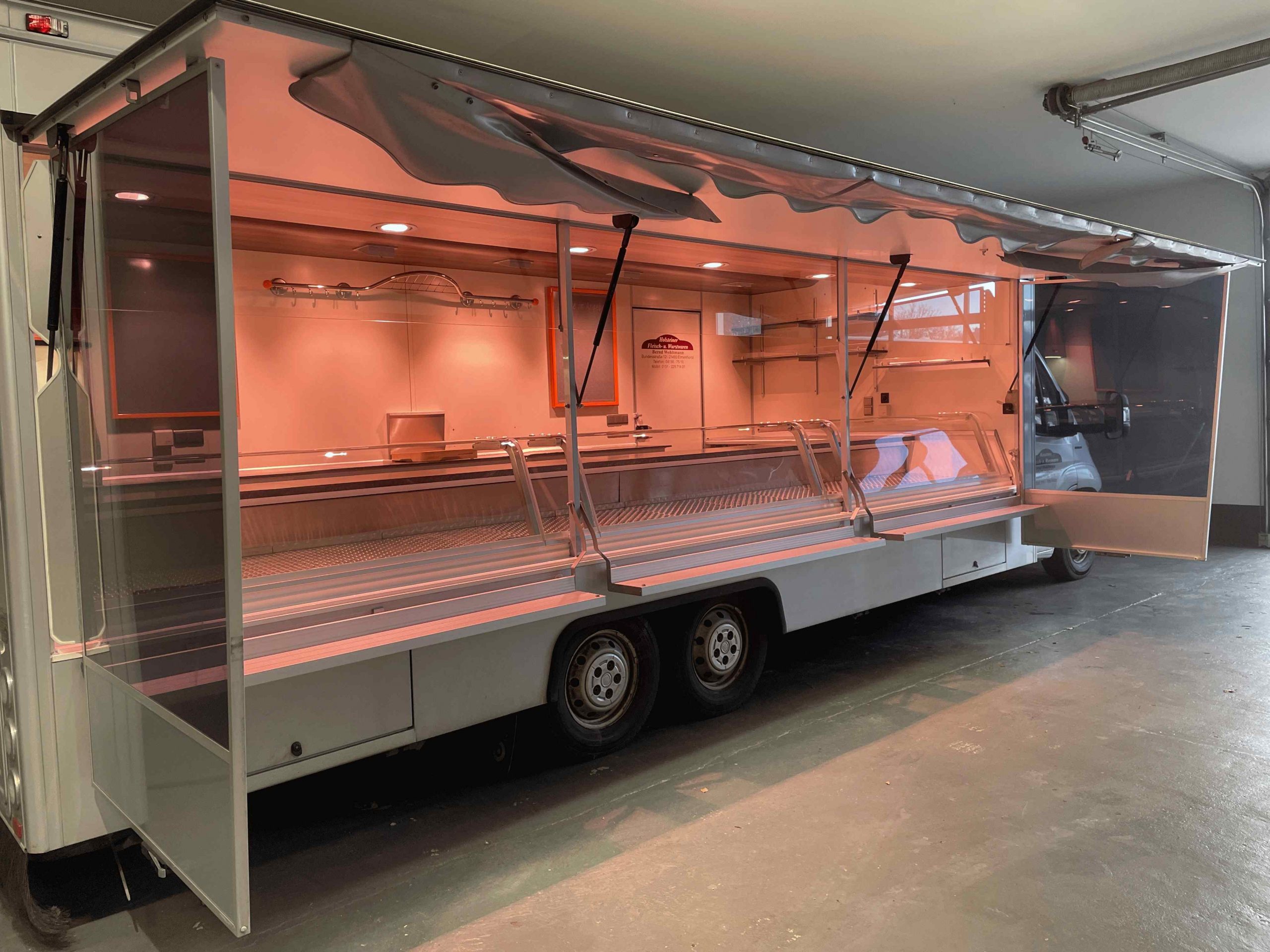 Gepflegtes Wochenmarkt Verkaufsmobil. Panorama-Kühltheke mit verstärkter Leistung 32°, 4 Kühlfächer, 1 Kühlschrank, BÄRO LED-Strahler, Stromerzeuger für den Notbetrieb, Gasheizung, Alu-Seitenblenden, Metalliclackierung, Fiat mit Klimaautomatik, Rückfahrkamera, Radio Beifahrerdoppelsitzbank uvm.